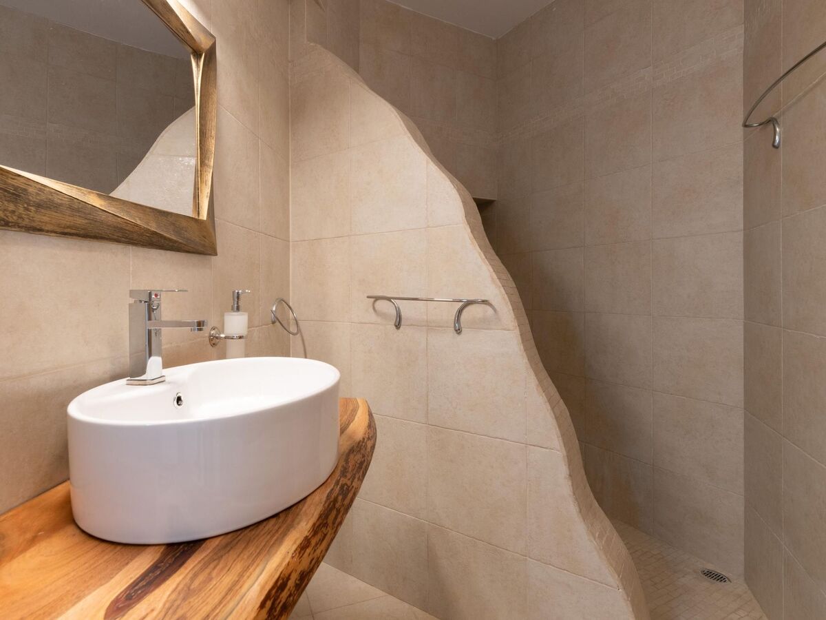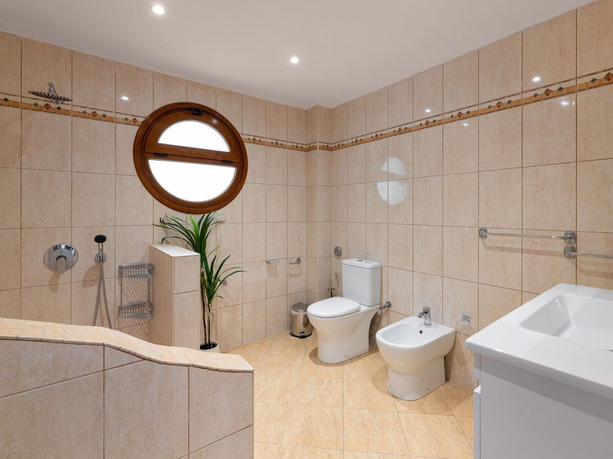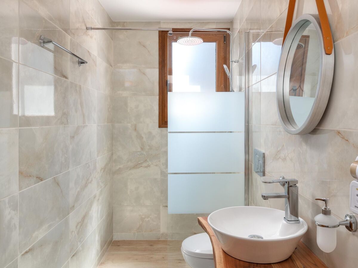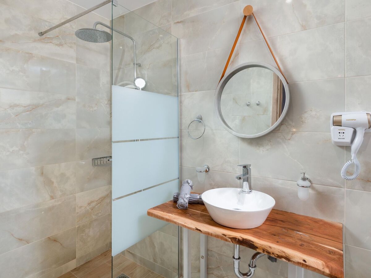 On the ground floor, there’s an airconditioned bedroom with a double bed and an ensuite bathroom with a shower.