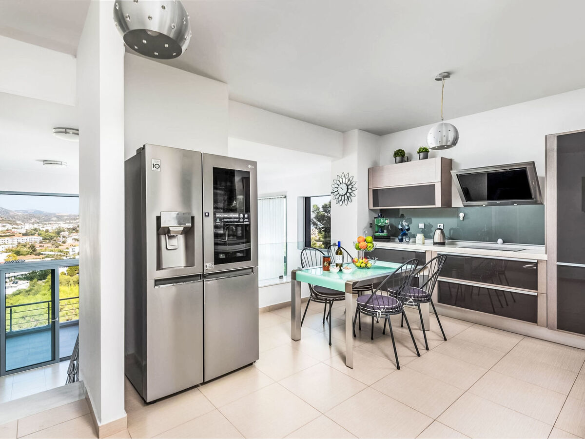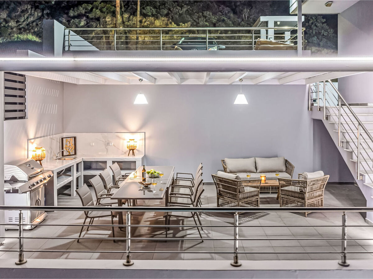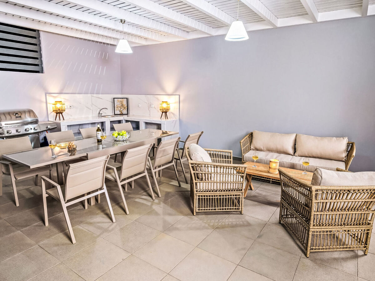 At the top level of the villa is found a fully equipped kitchen, along with a dining area and a cozy living room.