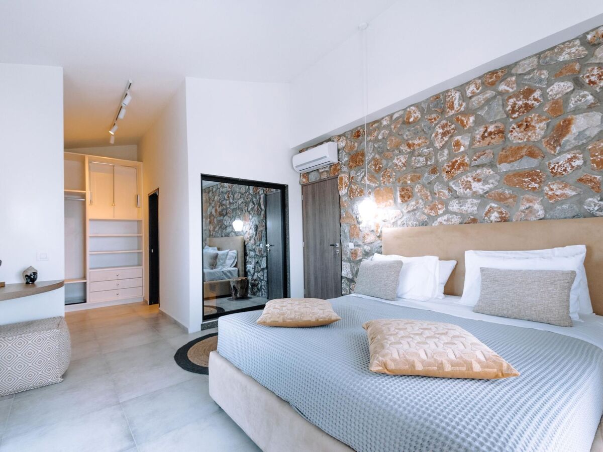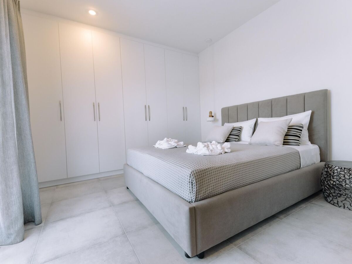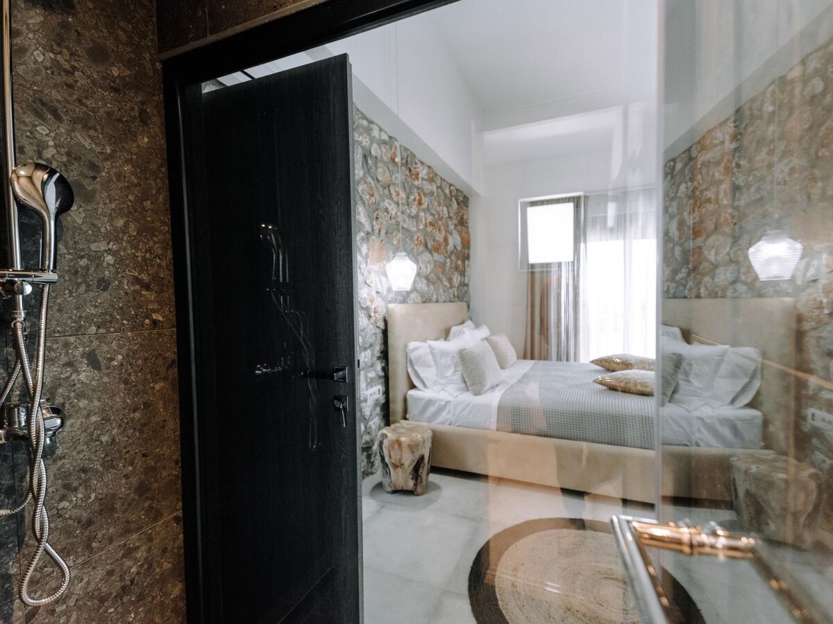 One of the bedrooms includes an ensuite luxurious bathroom with a shower and a balcony with a view of Ialysos.