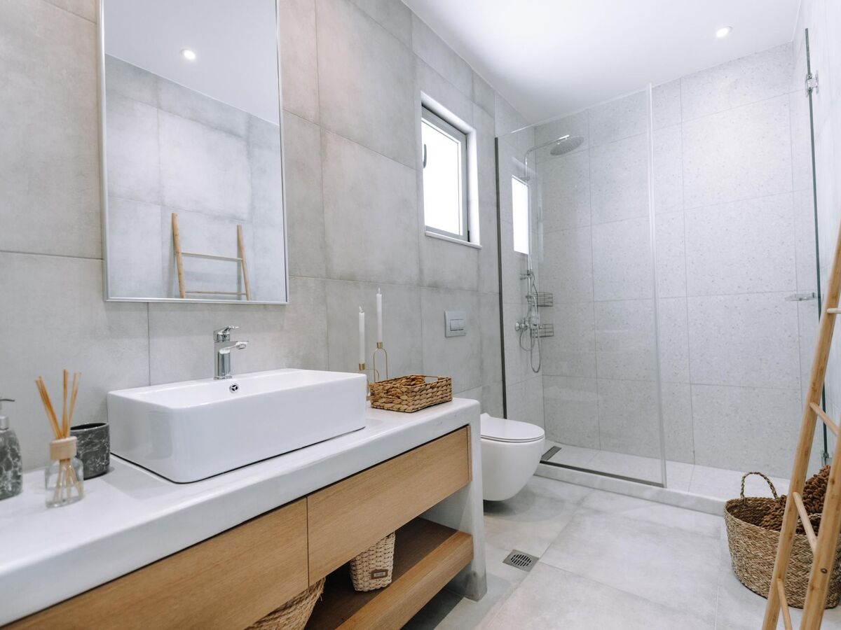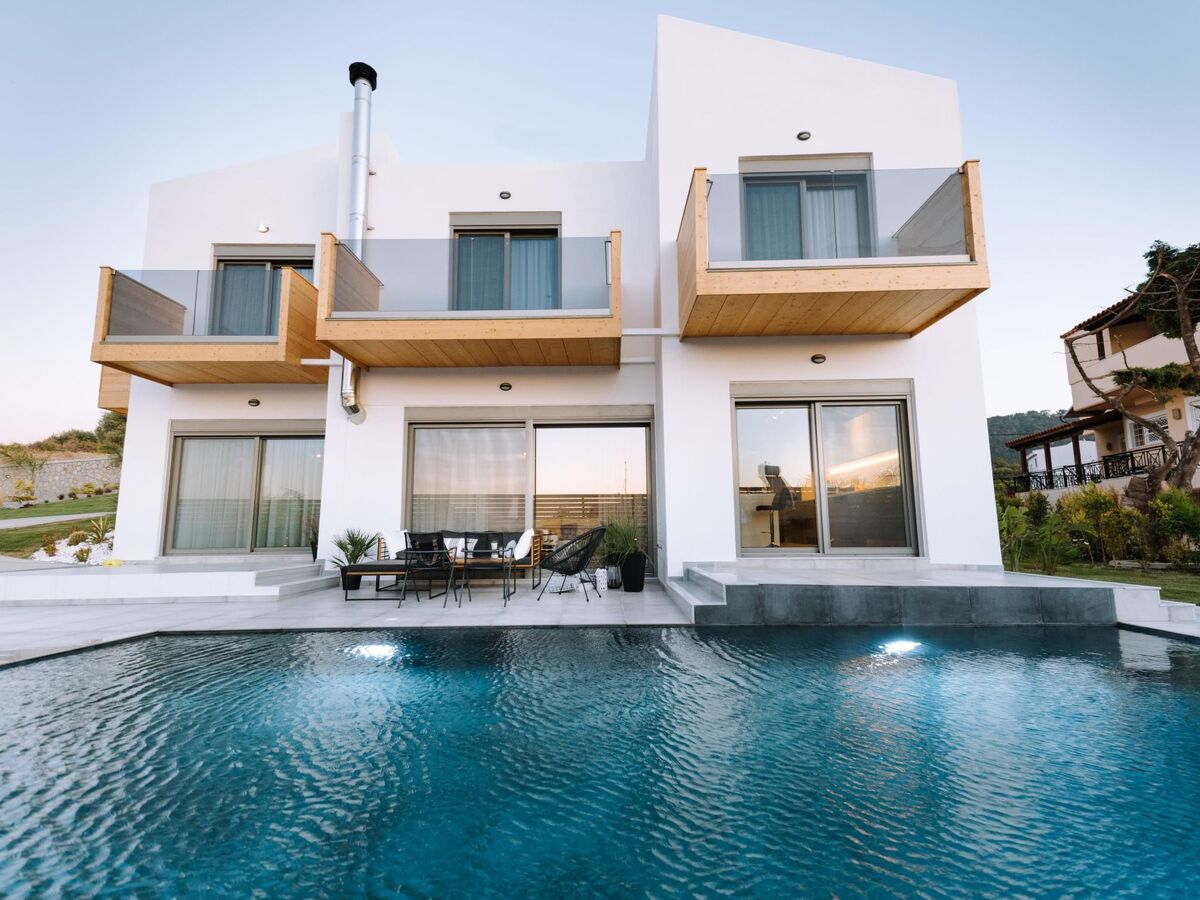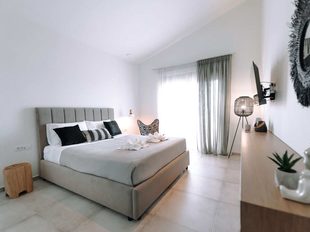 One of the bedrooms includes an ensuite luxurious bathroom with a shower and a balcony with a view of Ialysos.