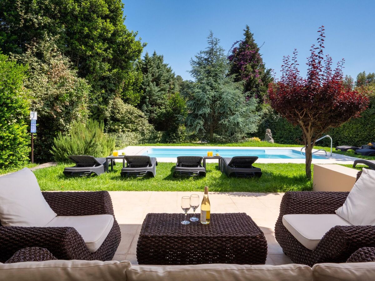 À l'extérieur, vous trouverez une piscine privée avec des chaises longues pour vous détendre, entourée d'un magnifique paysage verdoyant.