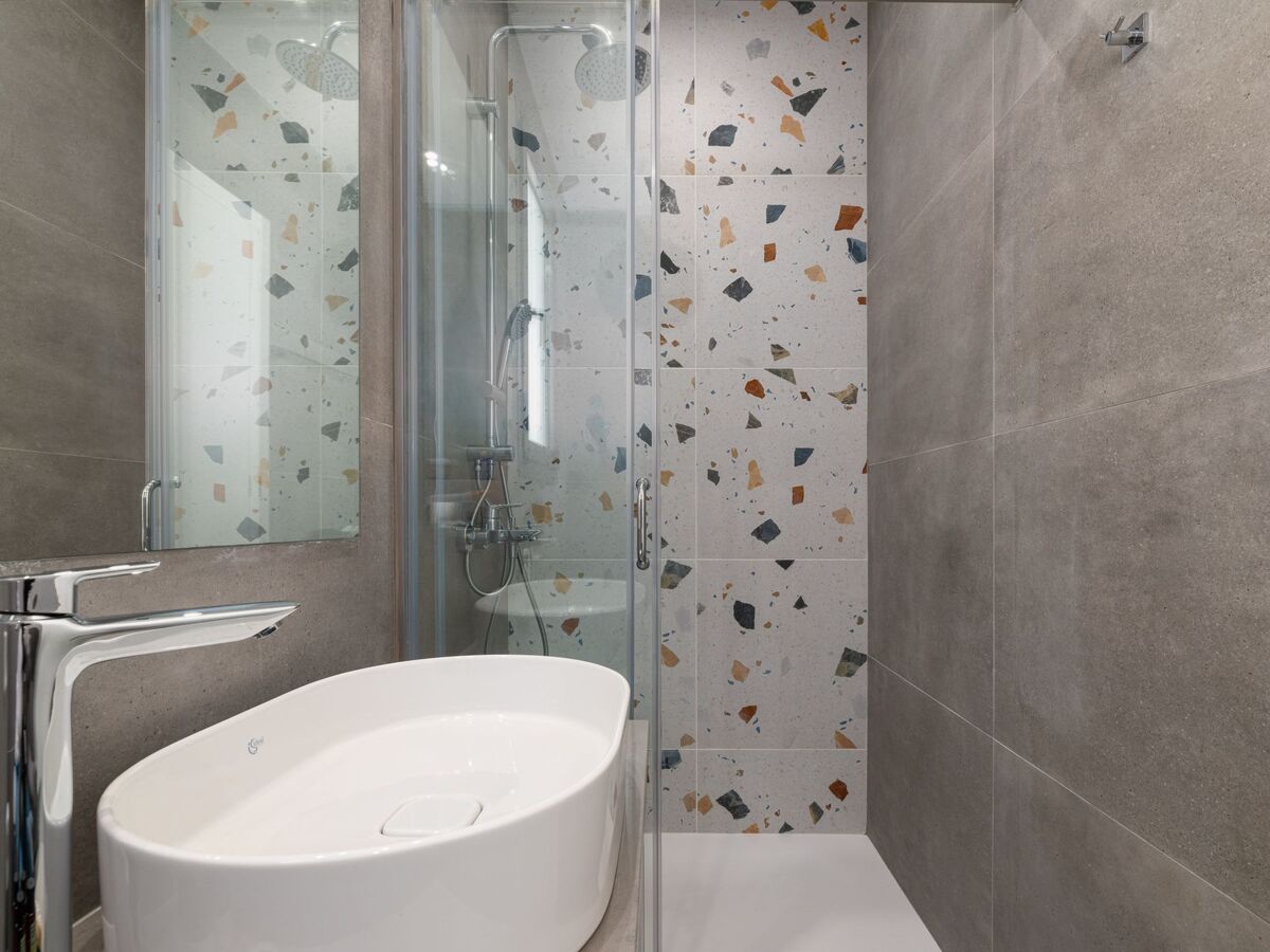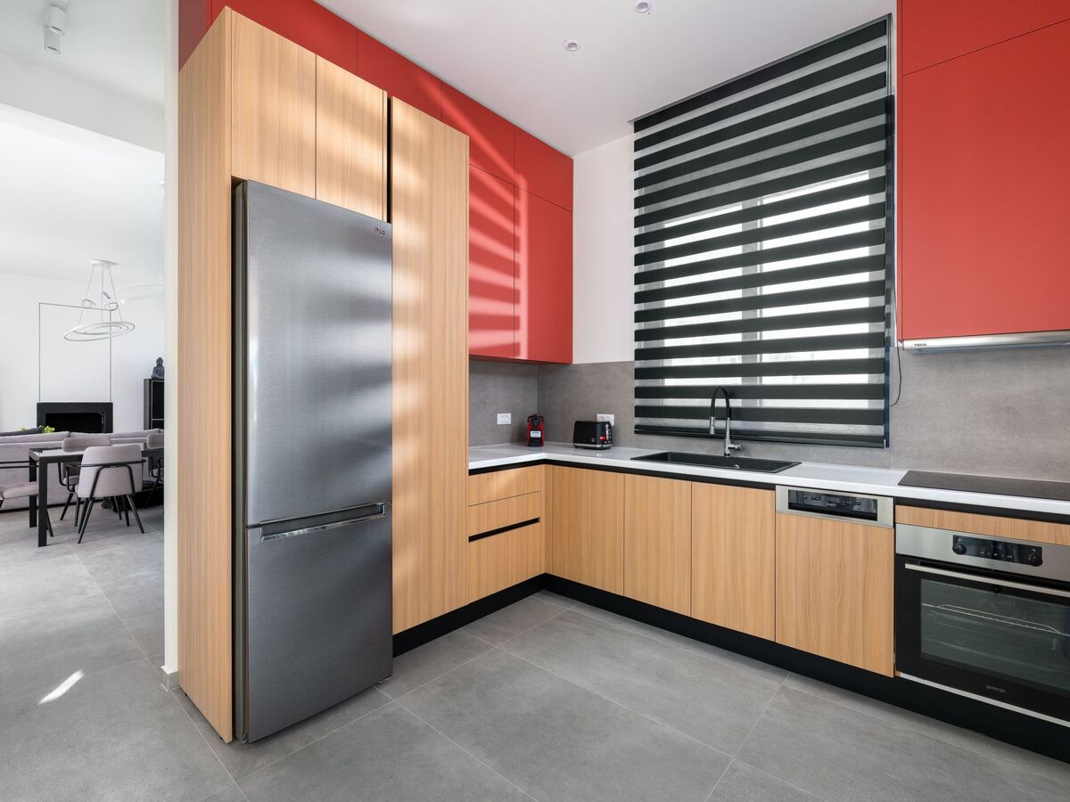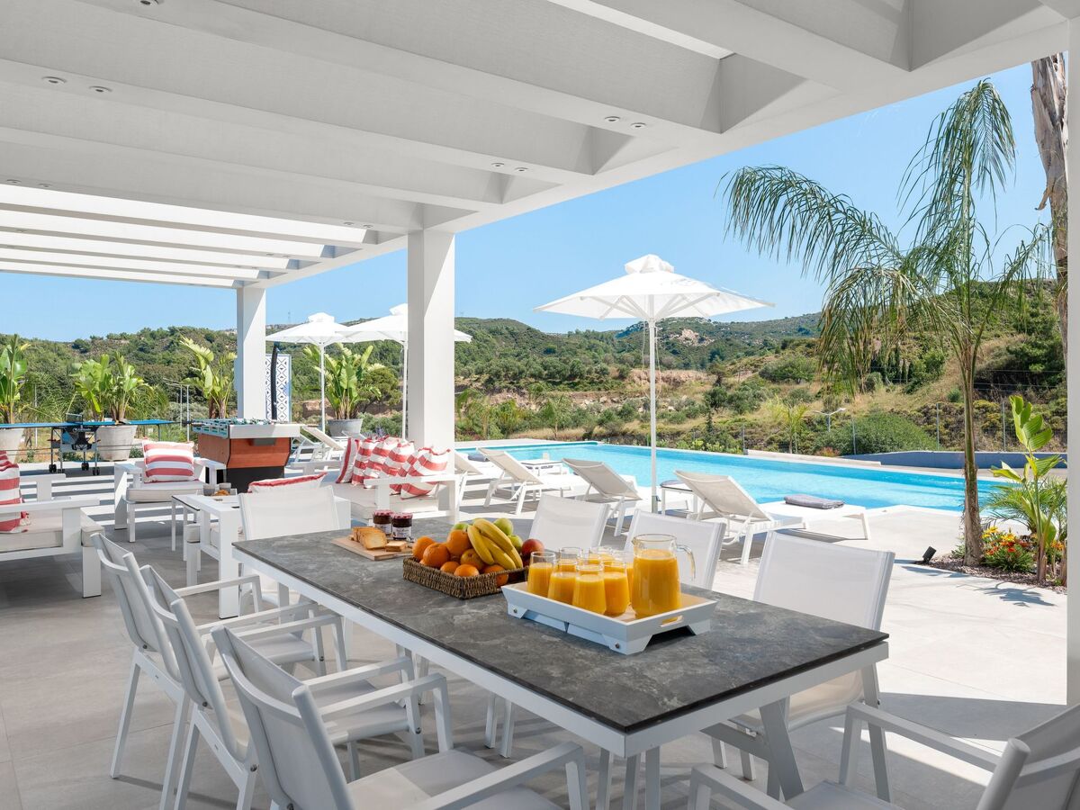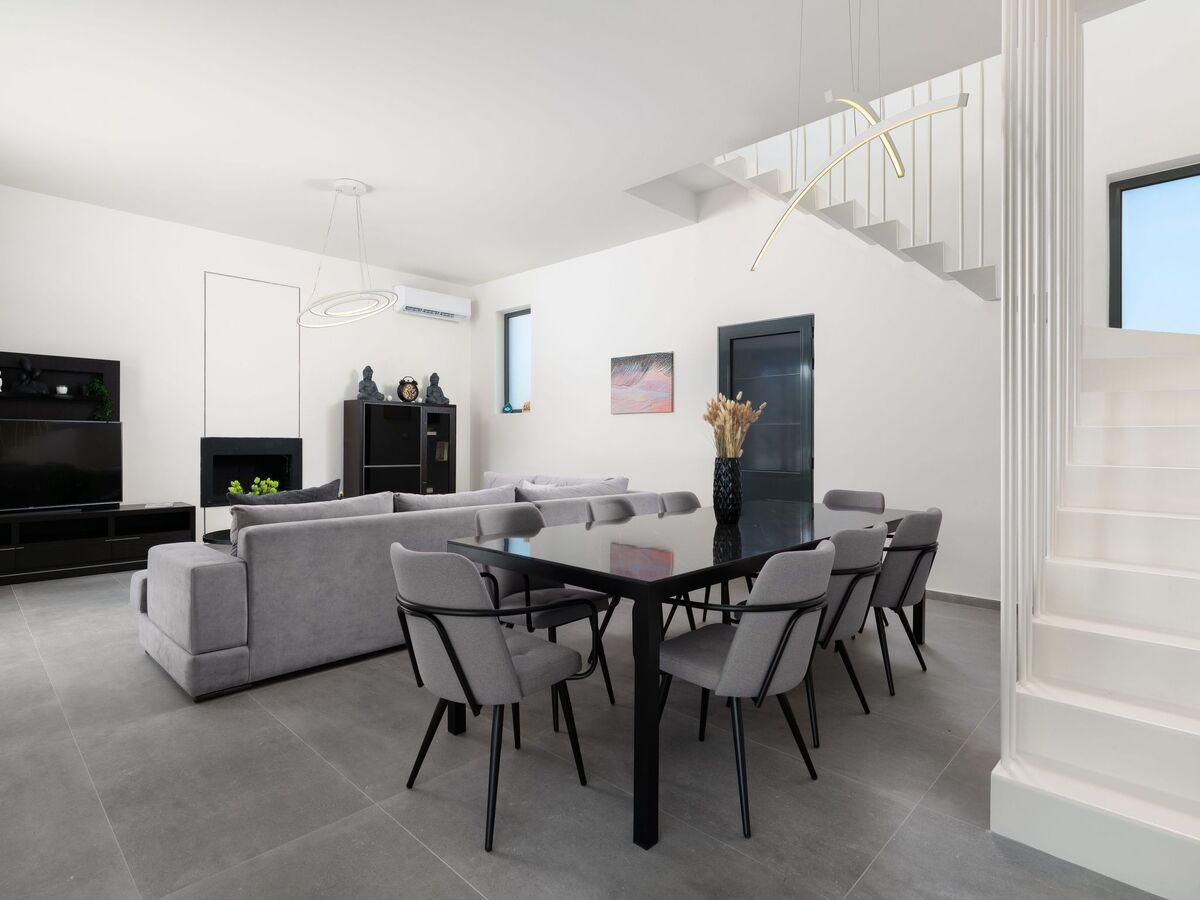 Adjacent, a modern dining area awaits, ready to host intimate gatherings of up to eight guests, while the fully equipped kitchen stands ready to inspire your culinary adventures, with direct access to the pool and barbecue area for seamless indoor-outdoor living.