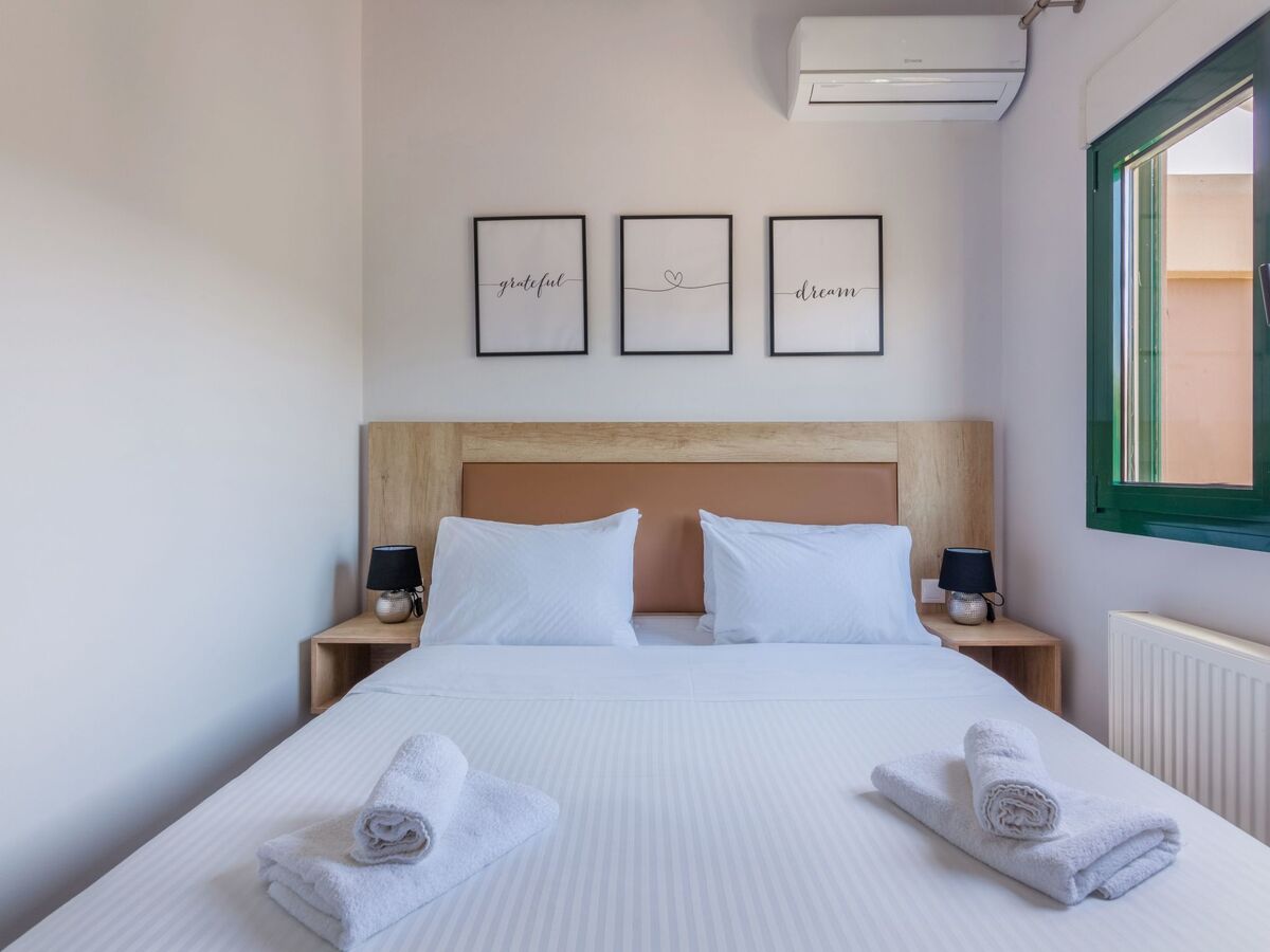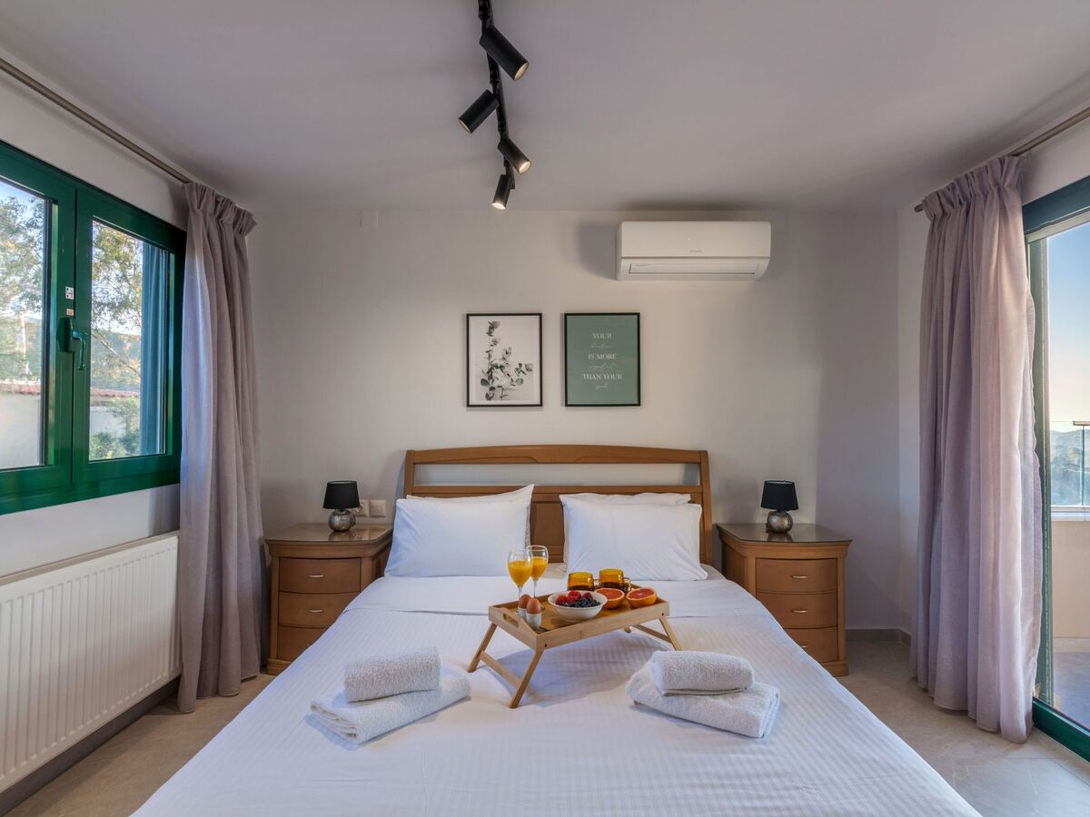 This bedroom has a Queen bed, air-conditioning and a window over-looking the Cretan mountains and the back yard.