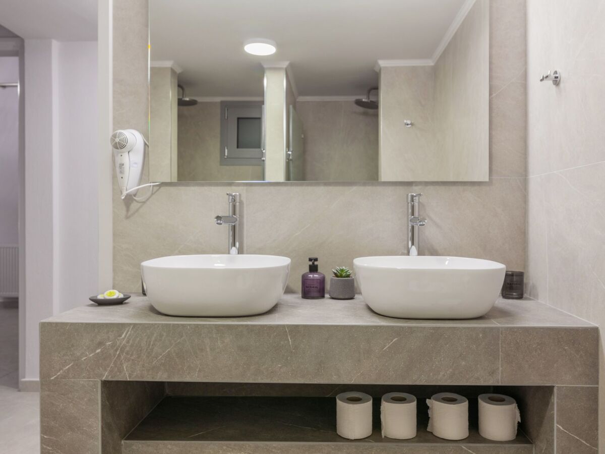 Villa Ourania is composed by the Main House (9 bedrooms fully air-conditioned, 6 bathrooms, 1 lounge, 1 living area, a kitchen) and a Guest House (2 en-suite bedrooms, 1 kitchen with living area), which in case of groups more that 18 people is rented together for a total of 11 bedrooms and 8 bathrooms.