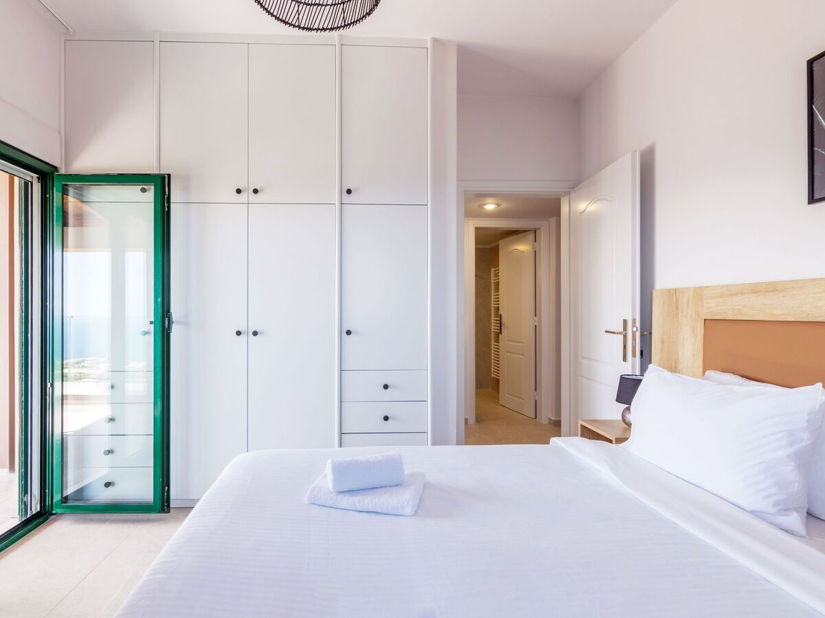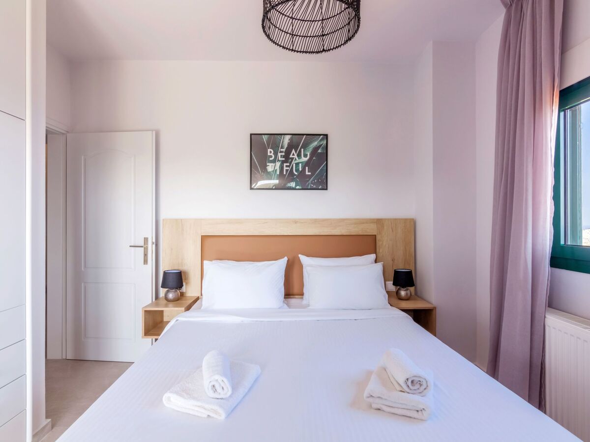 “Fenia” bedroom is the largest one, has a Queen bed, two windows, as well as the access to the shared balcony with “Chrysi” bedroom, over-looking to the pool area and the sea.