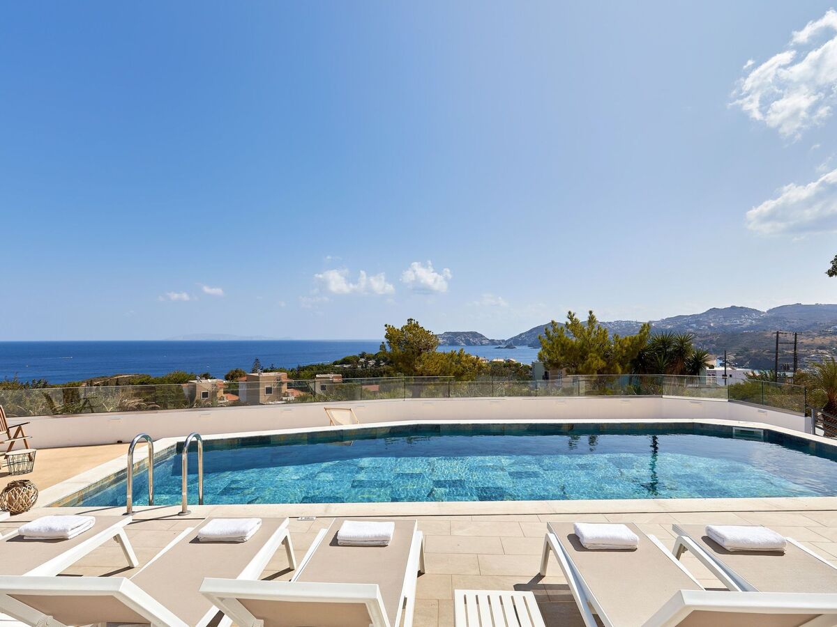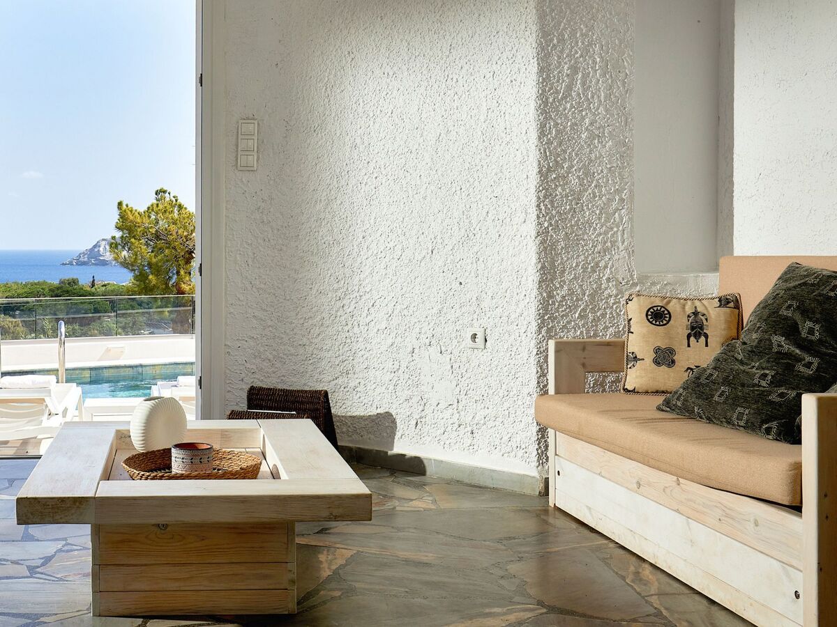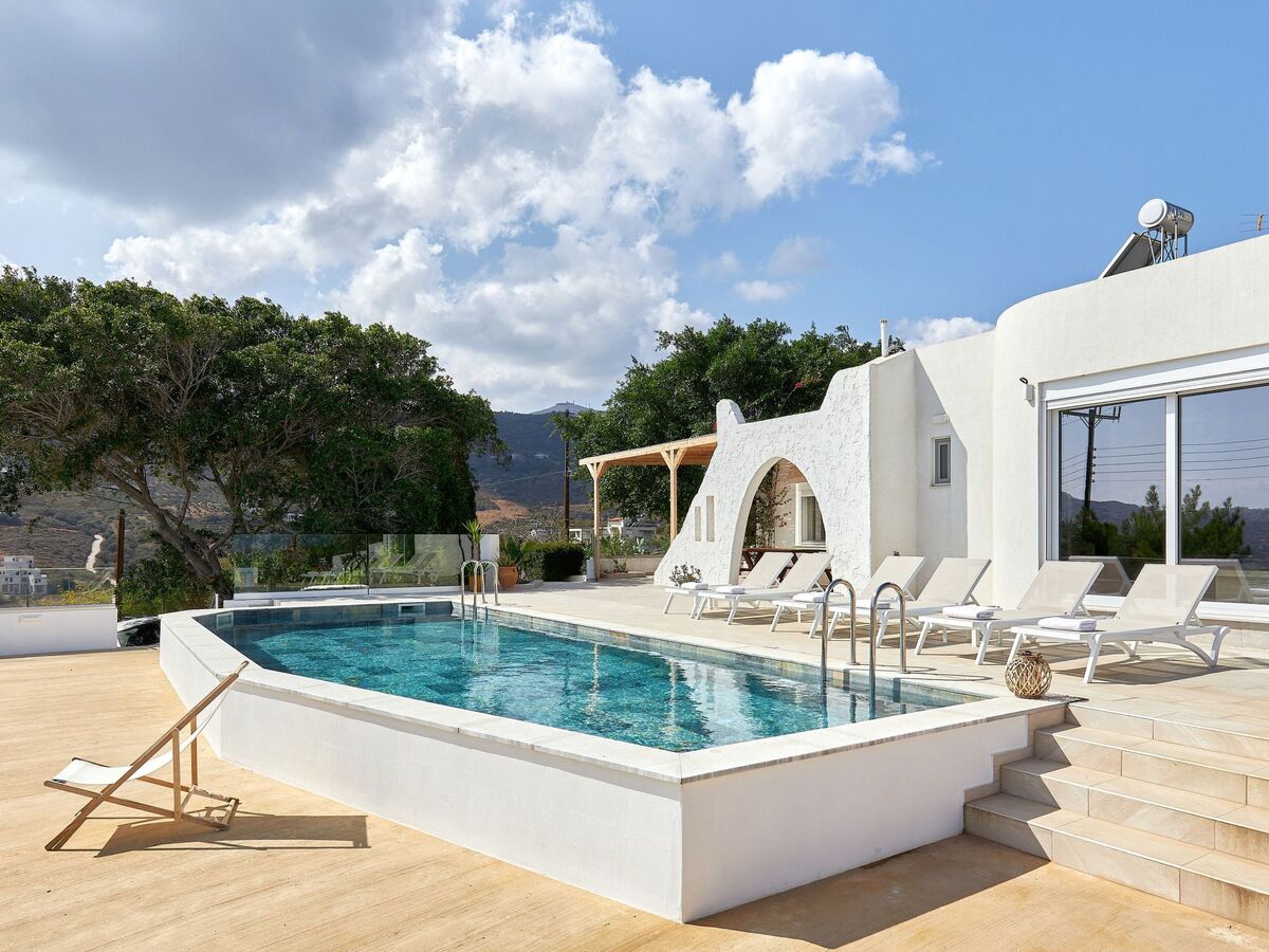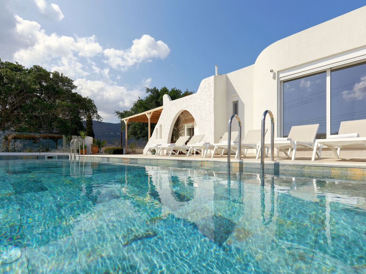 The Traditional Villa Elena (154sqm) features a private, heated swimming pool, a garden and a sea-view veranda, traditional style and comfortable setting with 3 bedrooms and a living room with 2 double sofa beds, thus able to host ideally up to 8 guests, with potential 2 additional guests if needed (up to 10 guests in total).