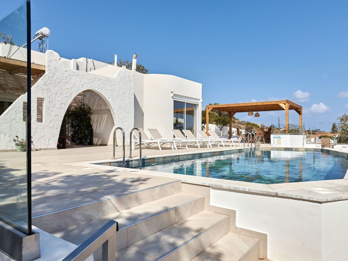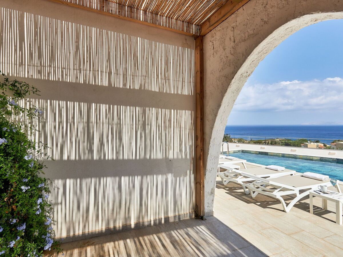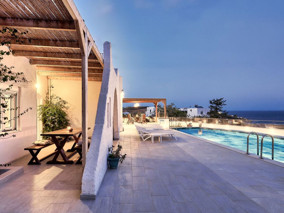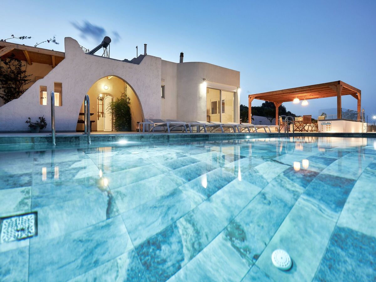 The Traditional Villa Elena (154sqm) features a private, heated swimming pool, a garden and a sea-view veranda, traditional style and comfortable setting with 3 bedrooms and a living room with 2 double sofa beds, thus able to host ideally up to 8 guests, with potential 2 additional guests if needed (up to 10 guests in total).