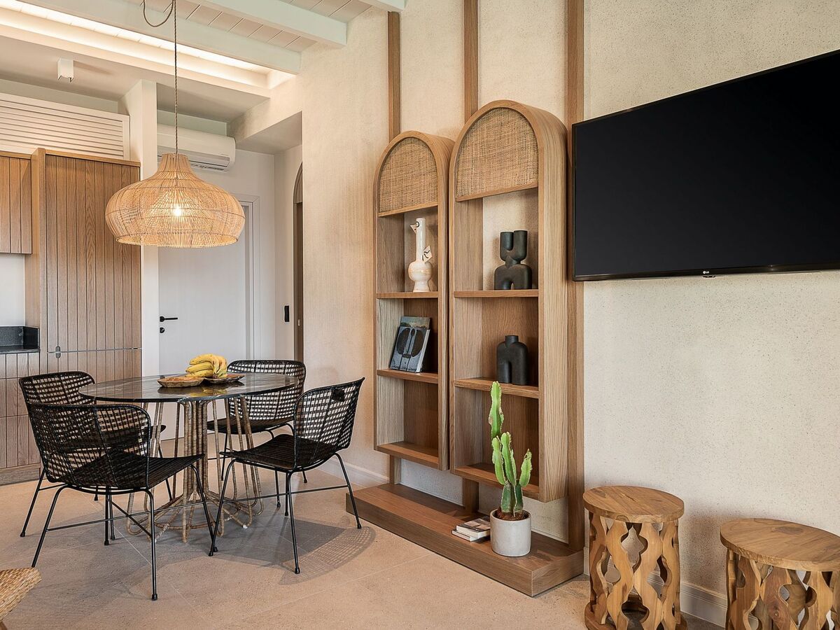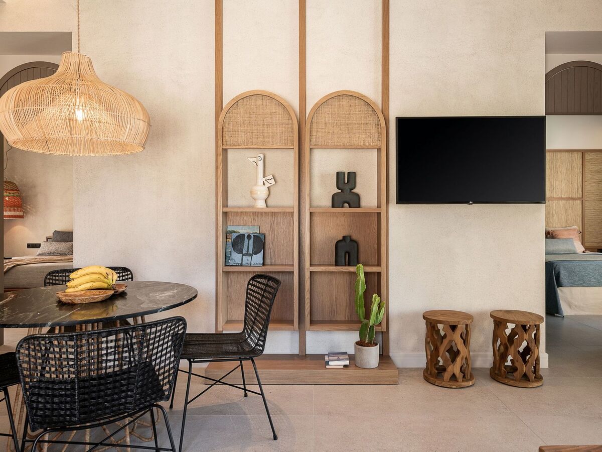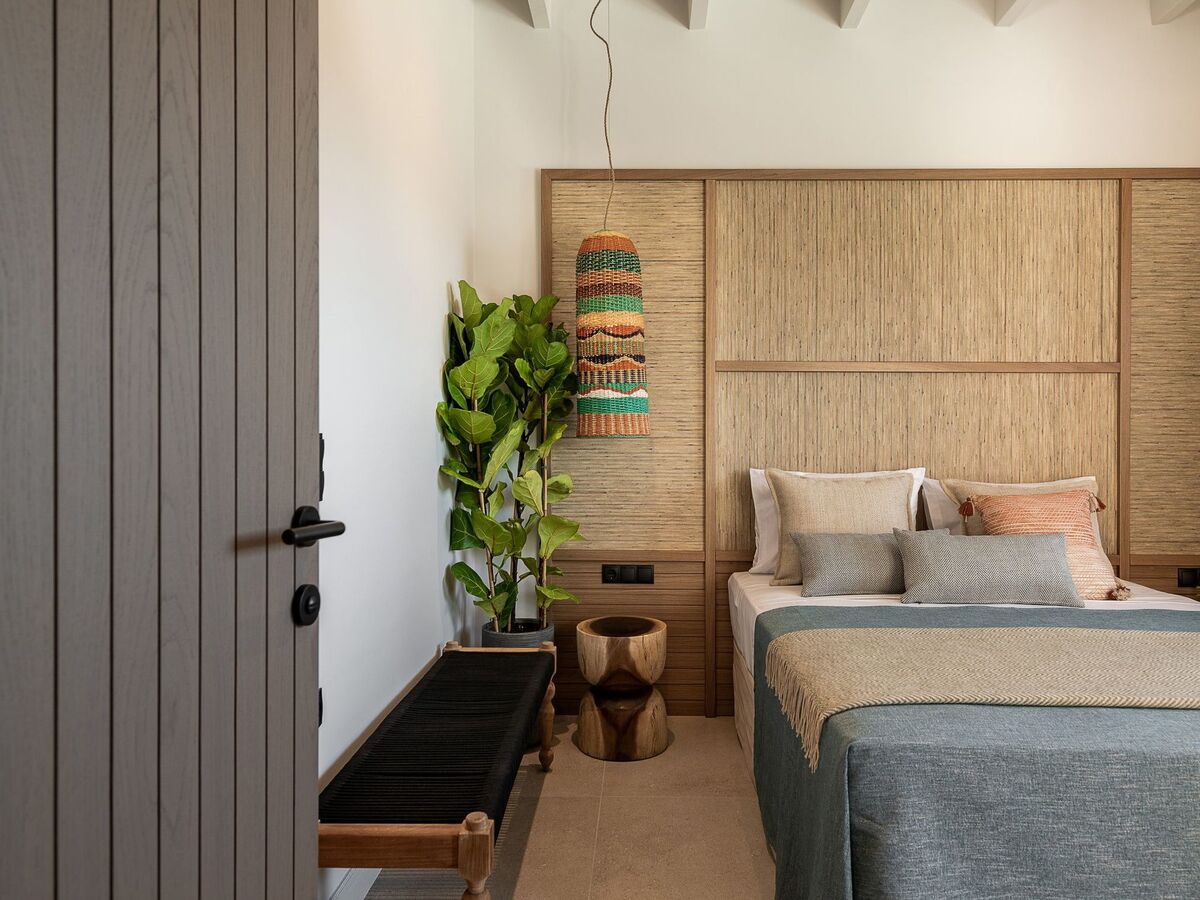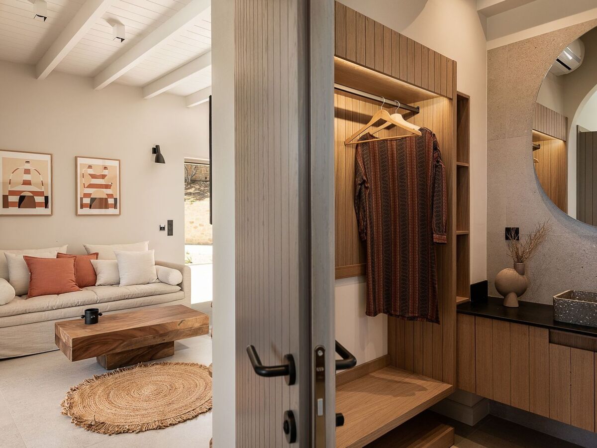 The earthy tones of the spaces merge into the deep blue of the sea and sky, offering an unforgettable sense of harmony and gentleness.