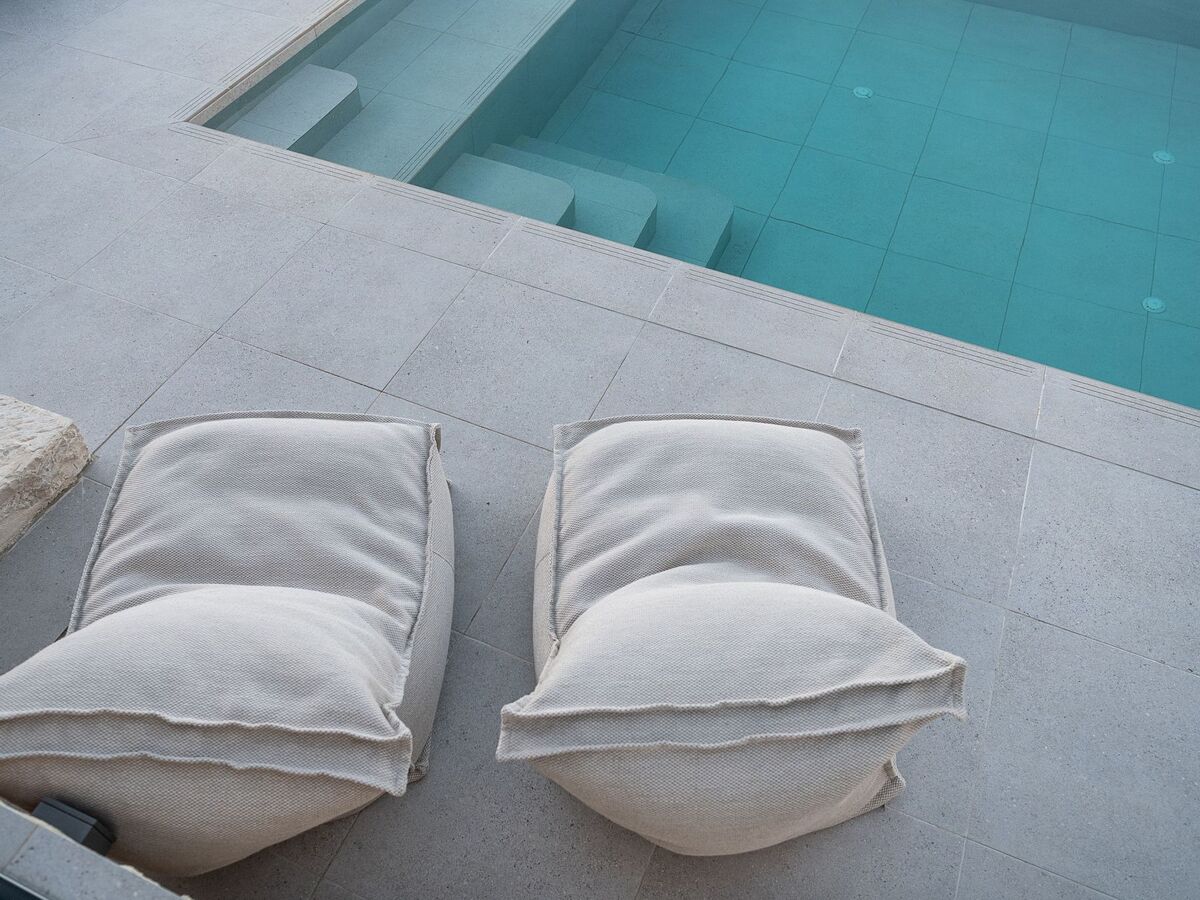 Just below the veranda, which includes a dining table and a barbeque (gas), there is the pool area, which has a private swimming pool with sunbeds, an outdoor shower, and lounge poufs.