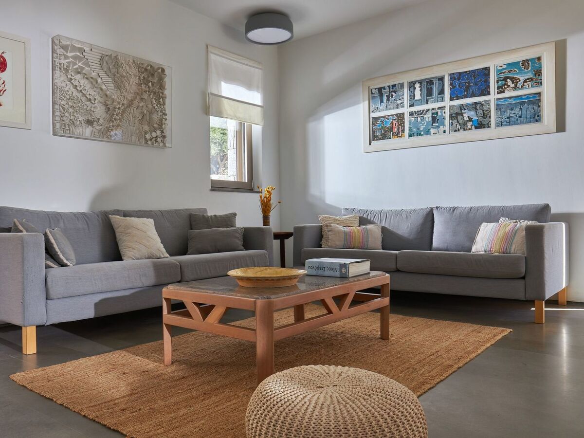 The exterior is well blended with the green olive groves that surround the estate and the absolute-blue color of the salt-water swimming pool offer an unparallel aesthesis of tranquility.