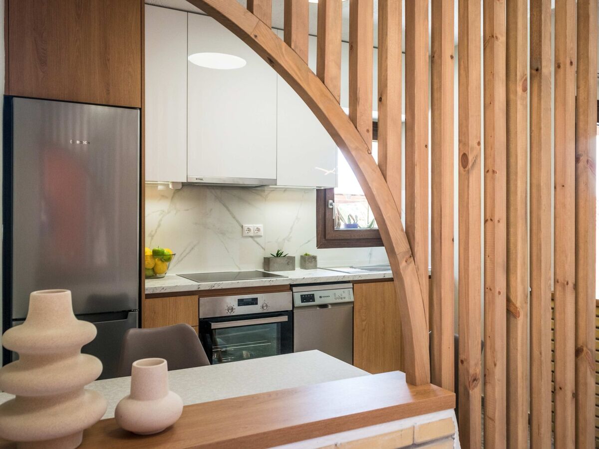 At the ground floor lies the kitchen with open plan living room, WC and the fireplace.