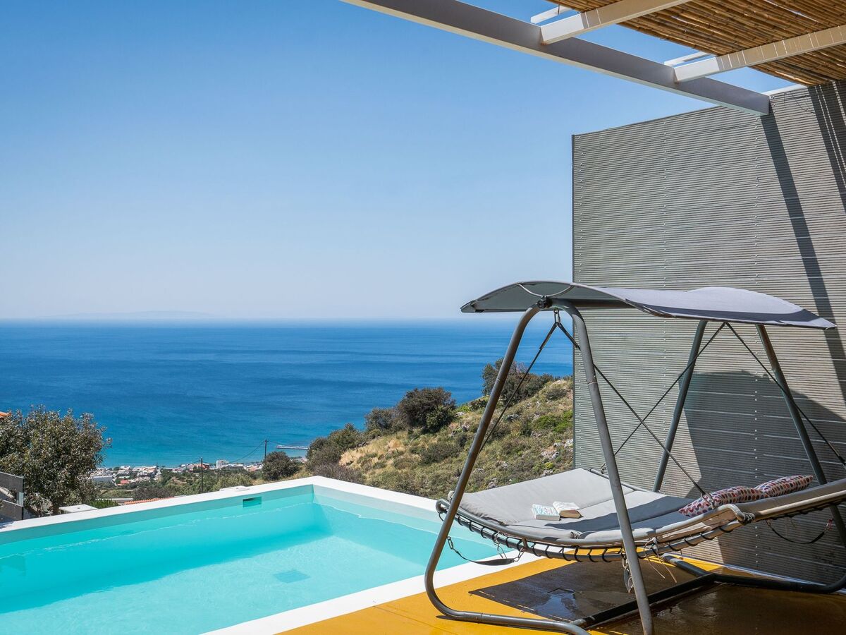 Outside on the pool terrace, the Mirthios Panorama Villa boasts spacious grounds built on levels with a private infinity pool overlooking the vast Libyan Pelagos beyond.