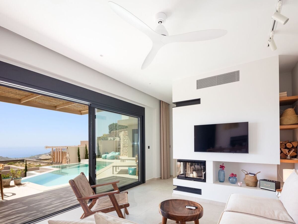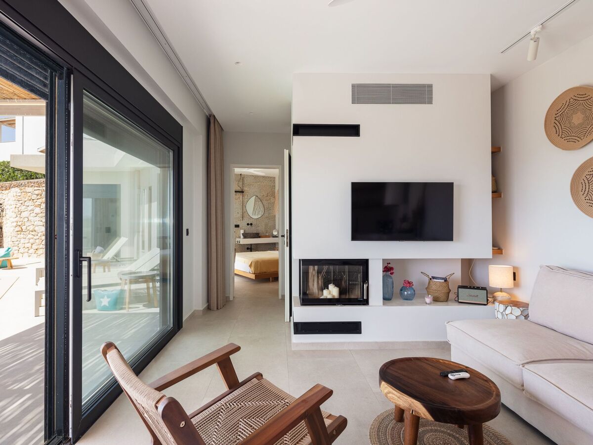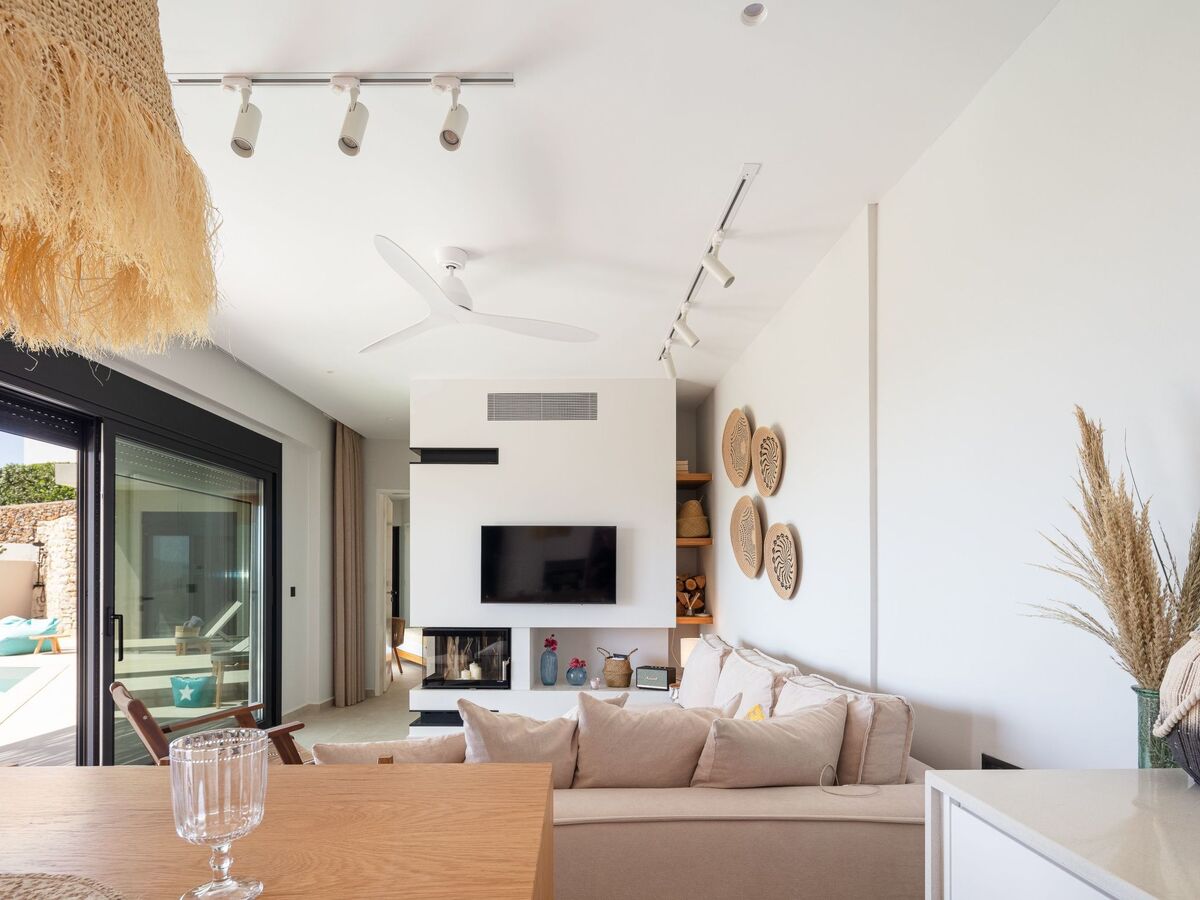 Step into the villa's open-plan living area, where you'll find a cozy and inviting lounge with comfortable seating, a built-in fireplace, and a 43-inch smart HDTV with satellite channels for your entertainment.
