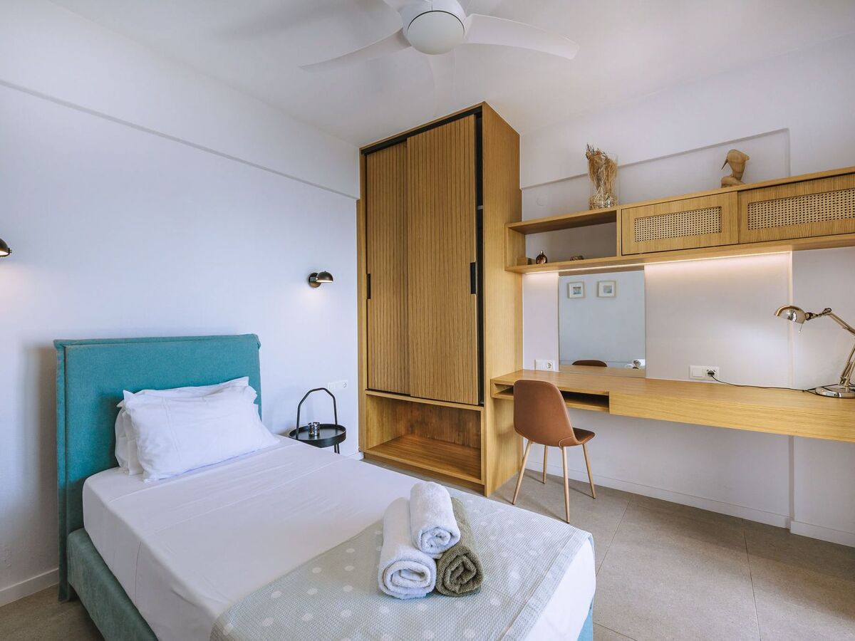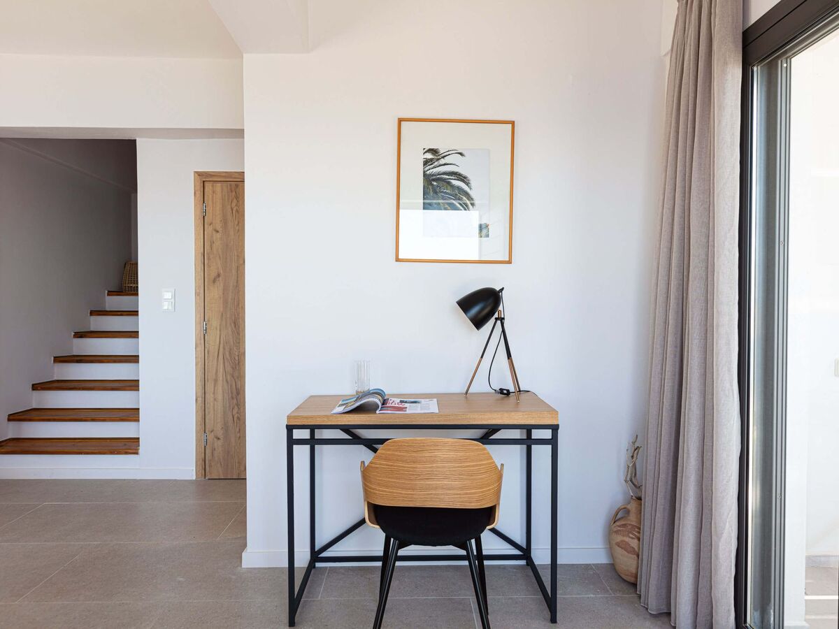 Villa Spiros has 3 fashionably decorated bedrooms, each boasting stylish and convenient desk and wardrobe spaces.