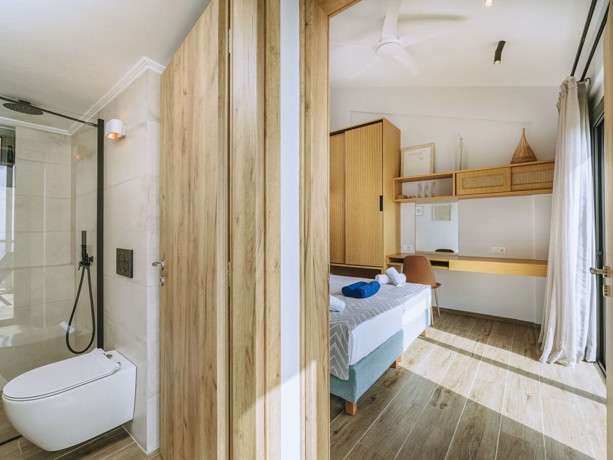 Villa Stefanos has 3 elegantly decorated bedrooms, each offering contemporary desk and wardrobe spaces.