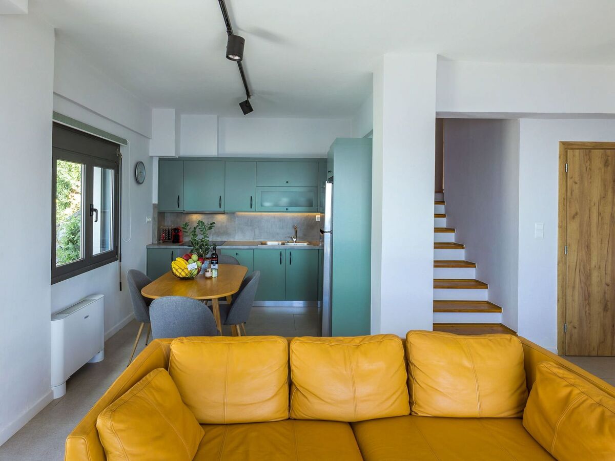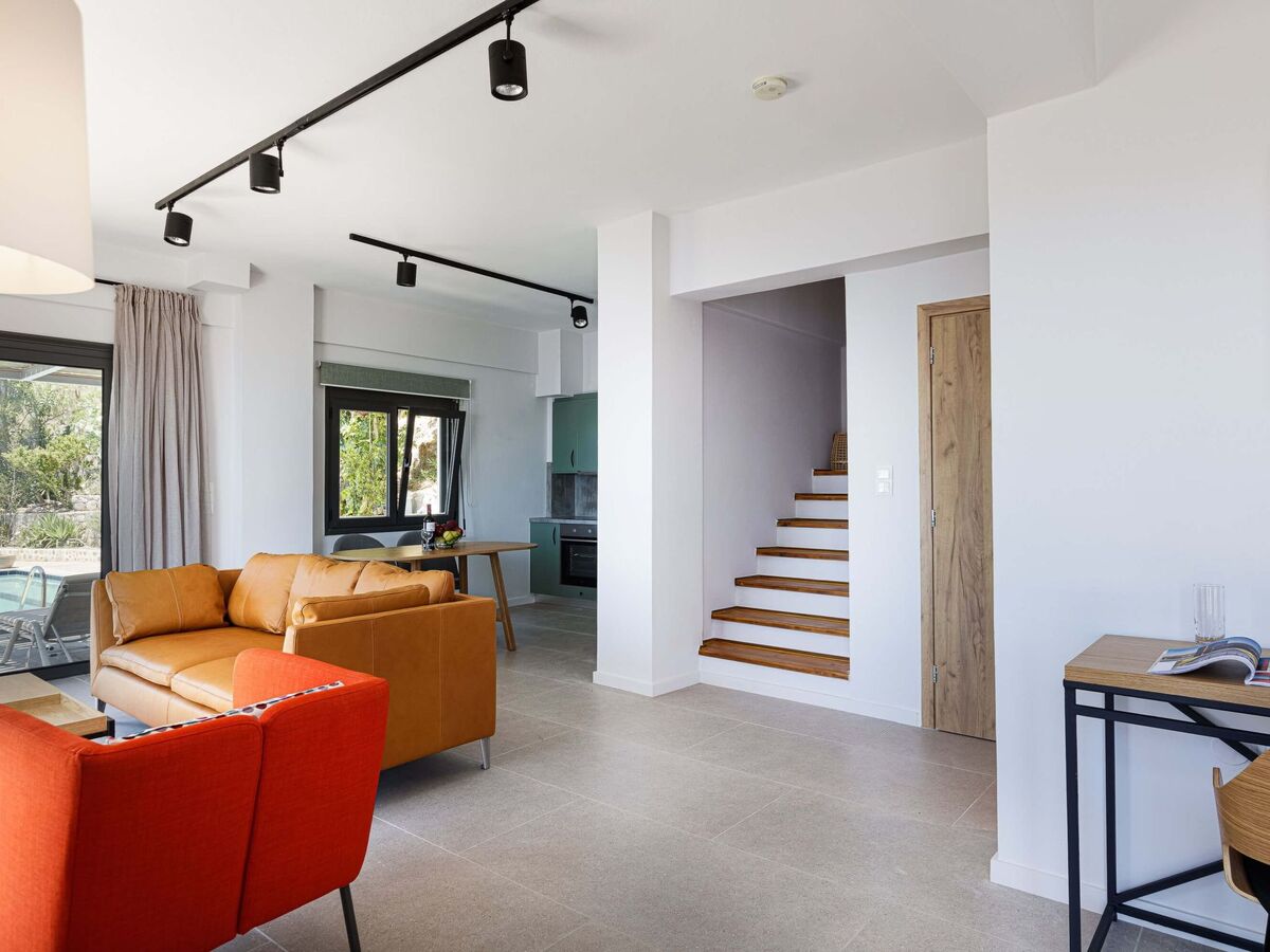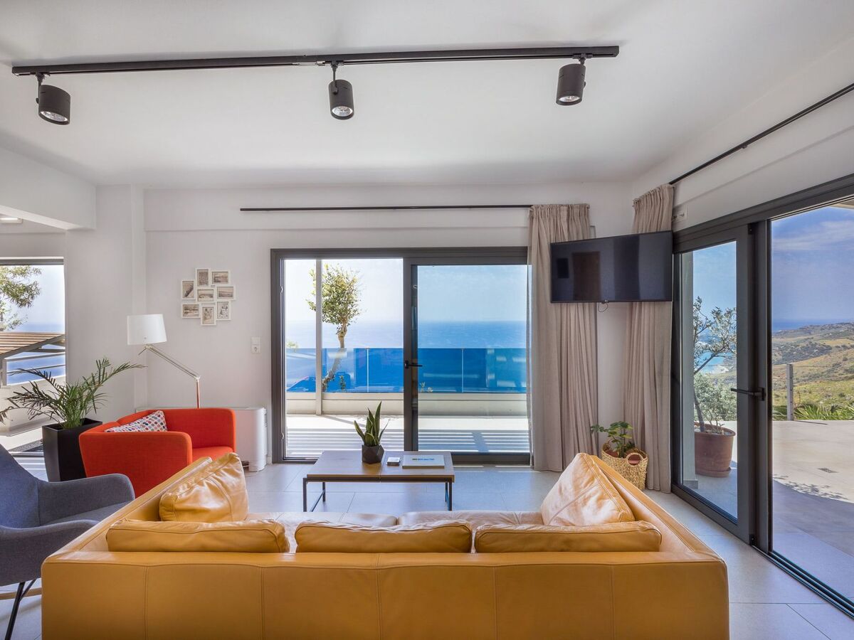 Villa Stefanos’s lounge is tastefully furnished and equipped with a large TV and trendy sofas.