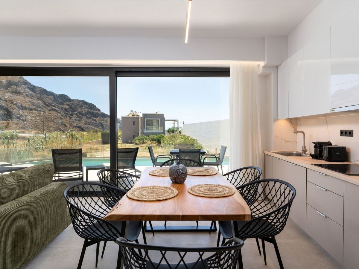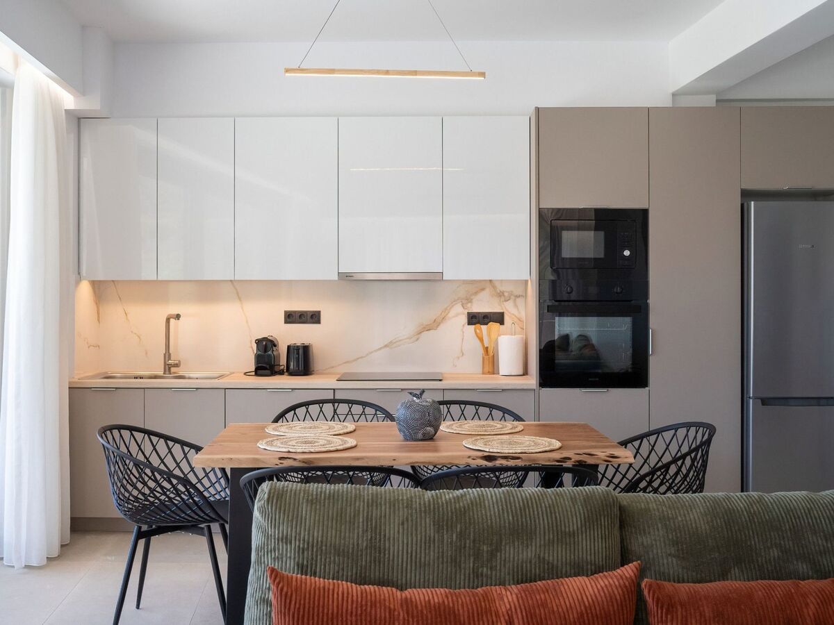 The modern, fully equipped kitchen includes everything needed for a self-catered stay, from morning coffee to evening feasts enjoyed on the terrace under the Cretan stars.