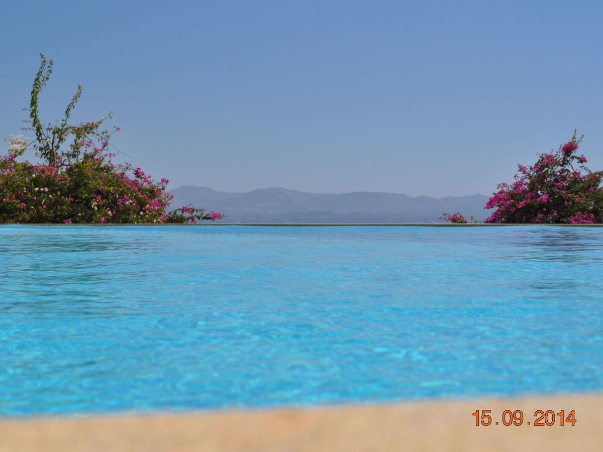 Looking out from the living room of the main house, you see the blue water of the swimming pool becoming one with the blue of the sea.