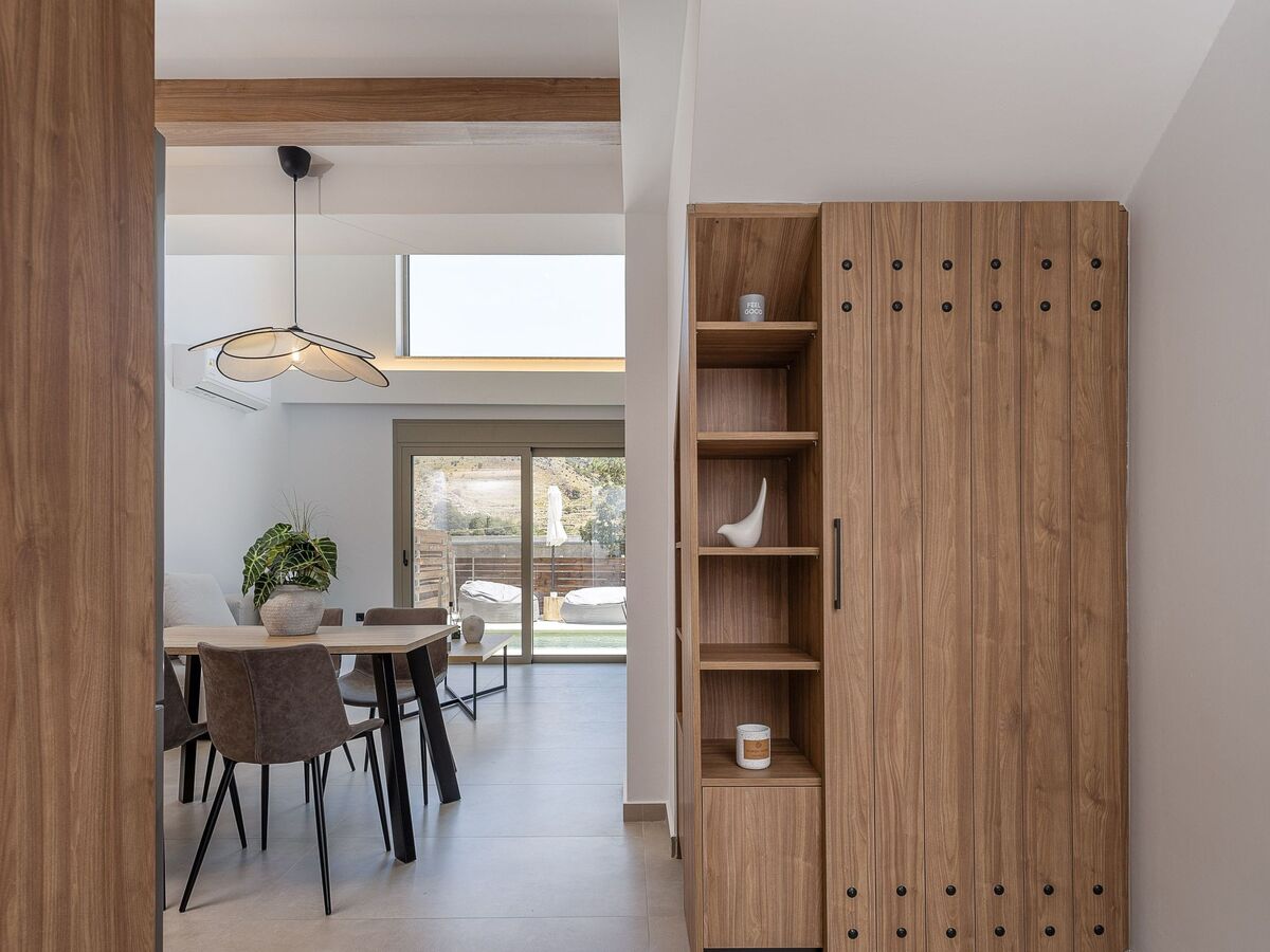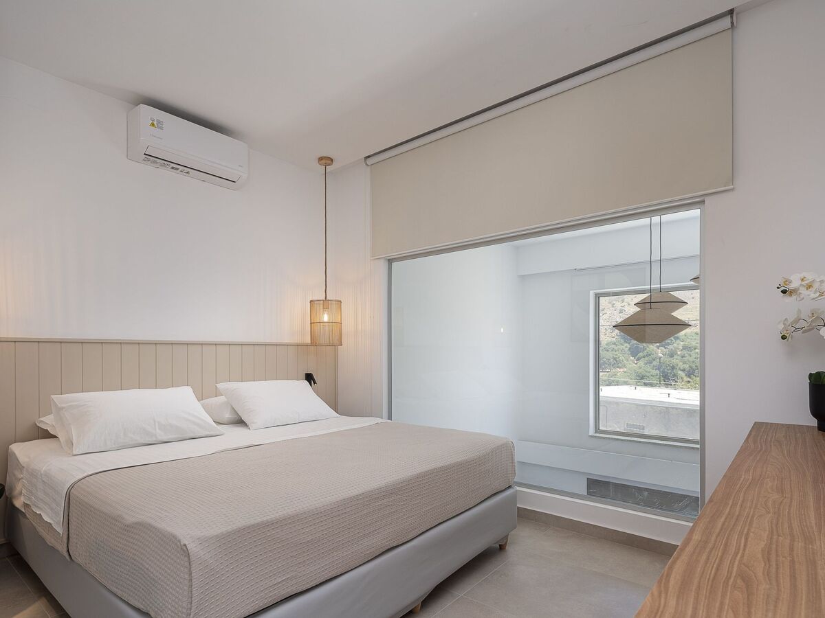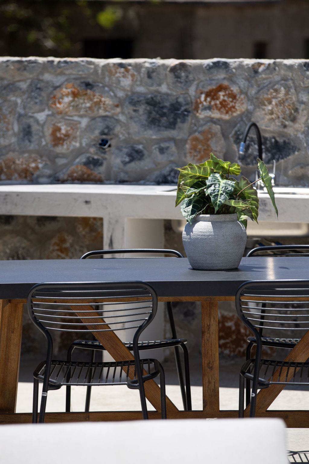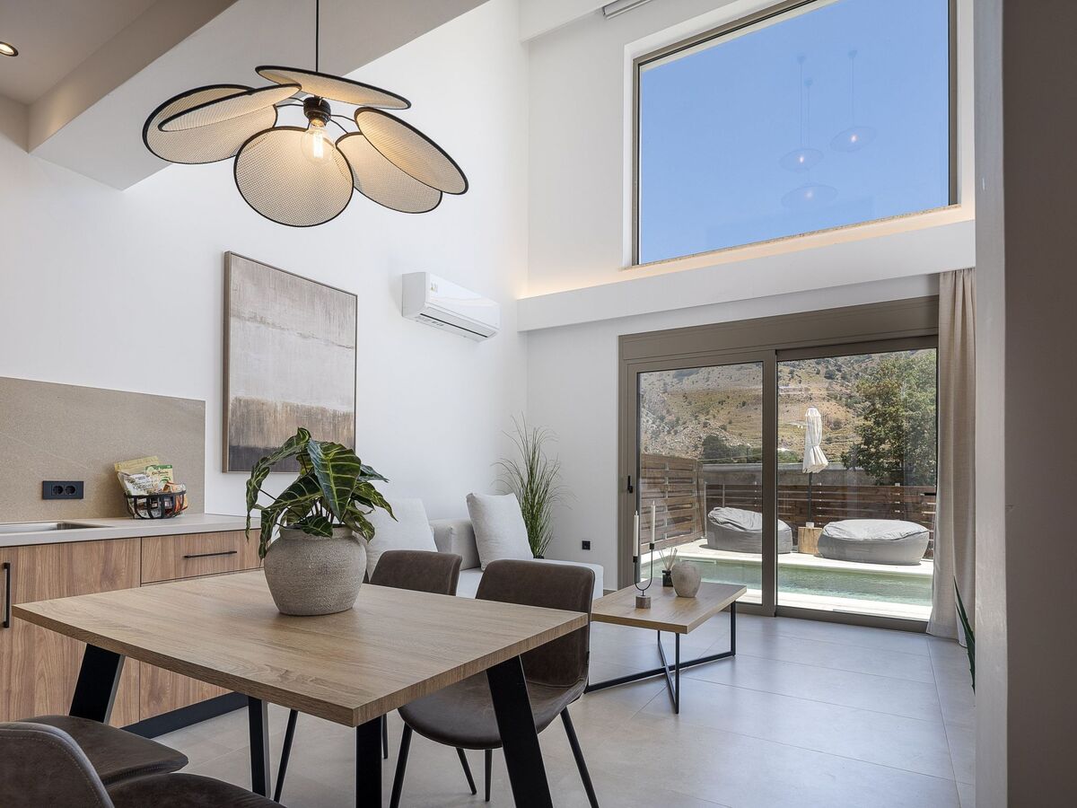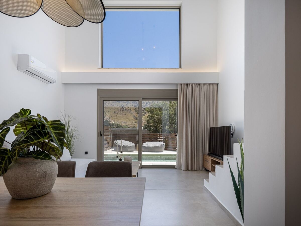 The villa offers a spacious living area, a private outdoor space, and breathtaking panoramic views of the rugged Cretan mountains.