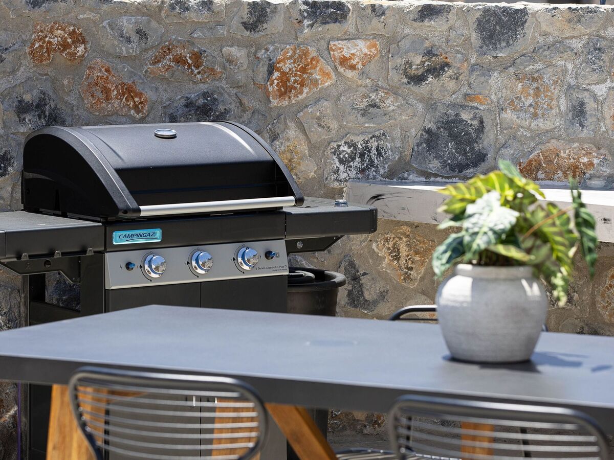 The villa offers its own private outdoor space, where a swimming pool, sun loungers, umbrellas, and a BBQ area create the perfect environment for relaxation and al fresco dining.