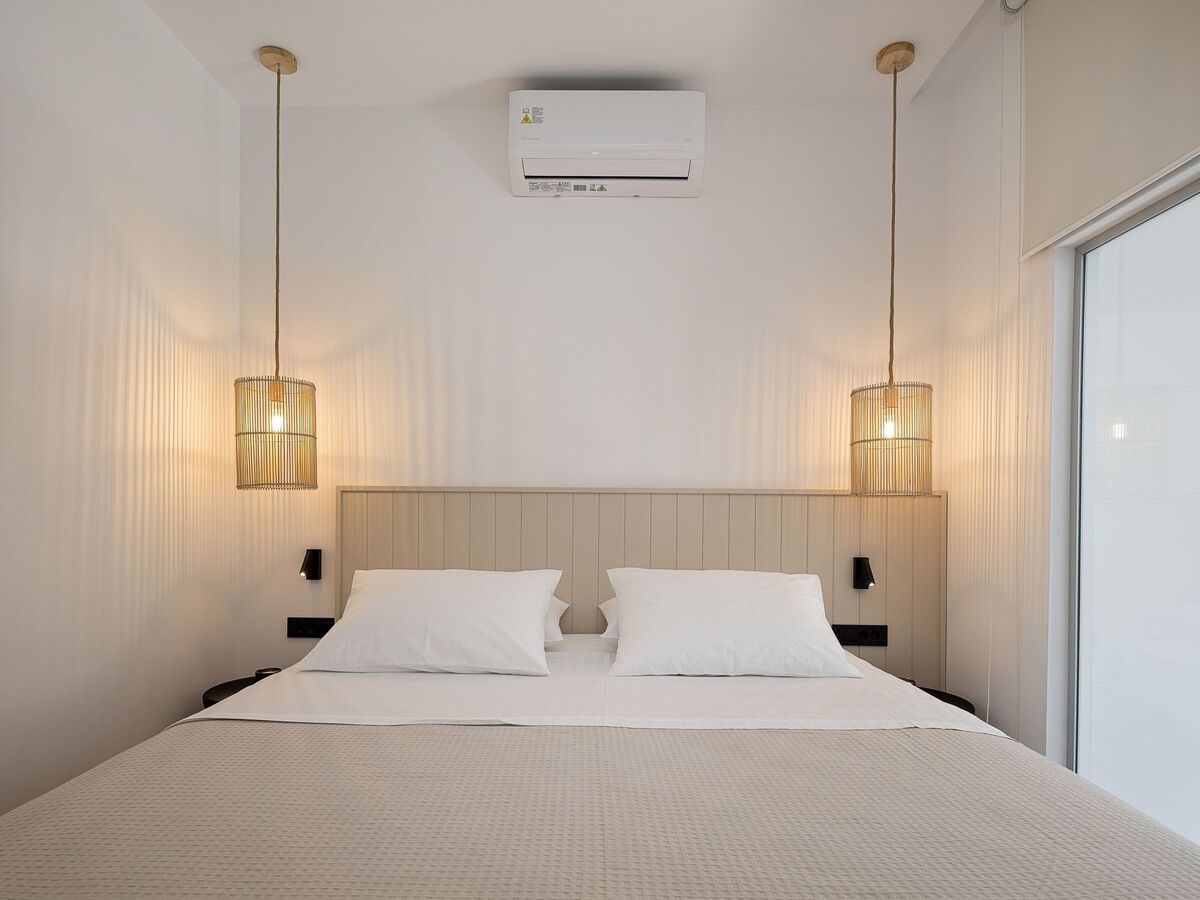 The ground level of the villa includes one beautifully designed bedroom, featuring a king-size bed, air conditioning, and direct access to the yard.