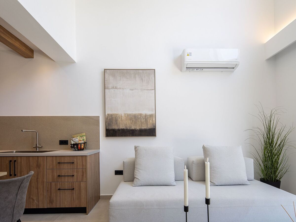 The villas feature a spacious open-plan living area, where guests can relax on a comfortable sofa while enjoying modern amenities such as a 50’’ Smart TV with satellite channels.