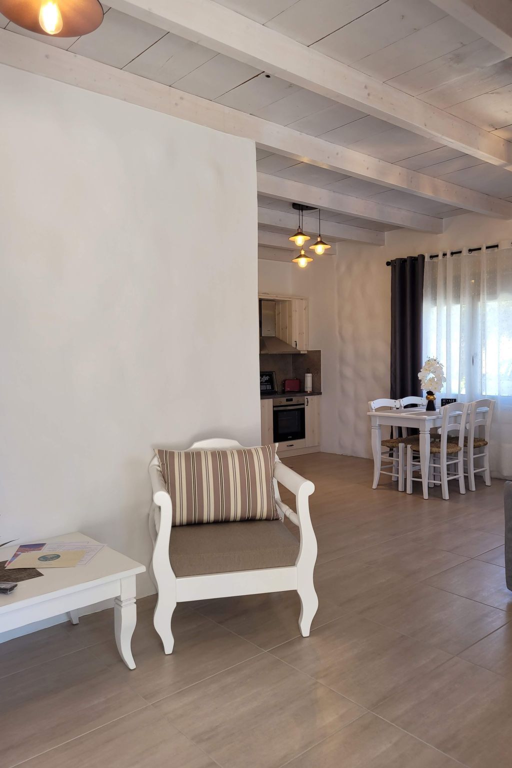Villa Efthimia has a bedroom with a large double bed and en-suite bathroom, as well as a living/dining area with a fully equipped kitchen.