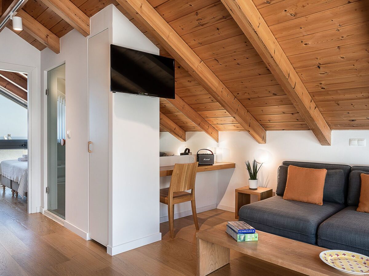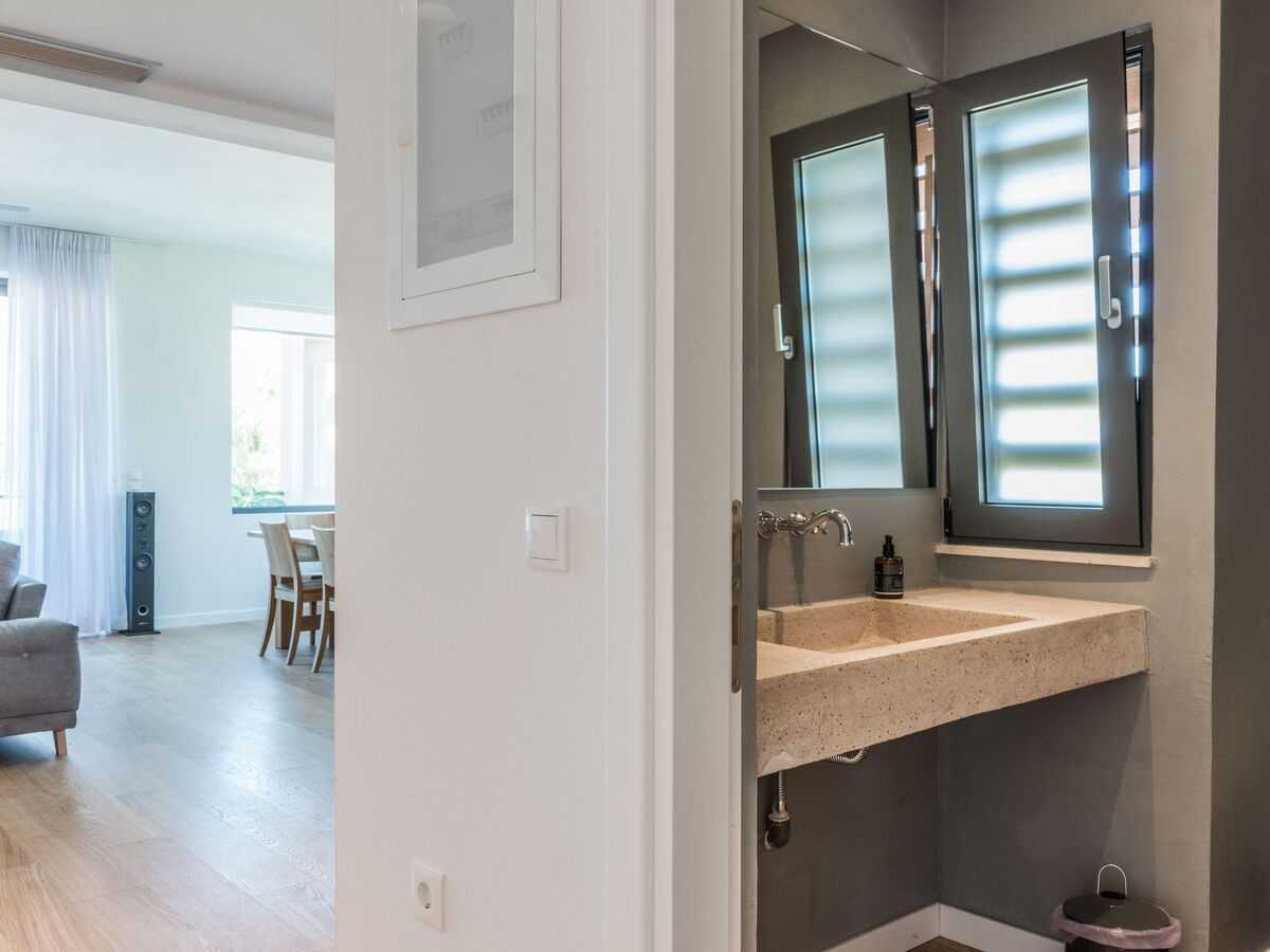 Around the 28 sqm heated swimming pool there is a sunbathing wooden deck and a lawn playground.