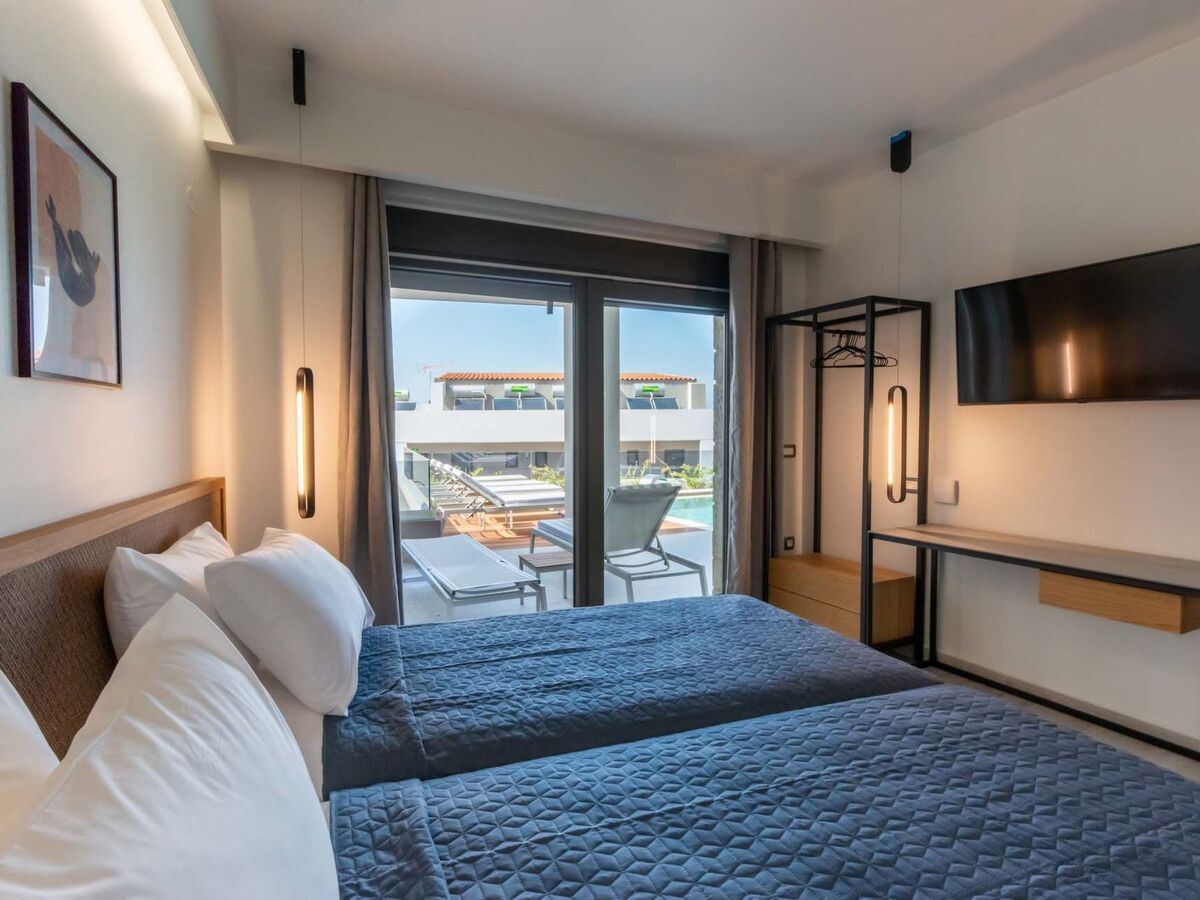 Dans l'espace extérieur, détendez-vous sur les chaises longues en profitant du soleil crétois.