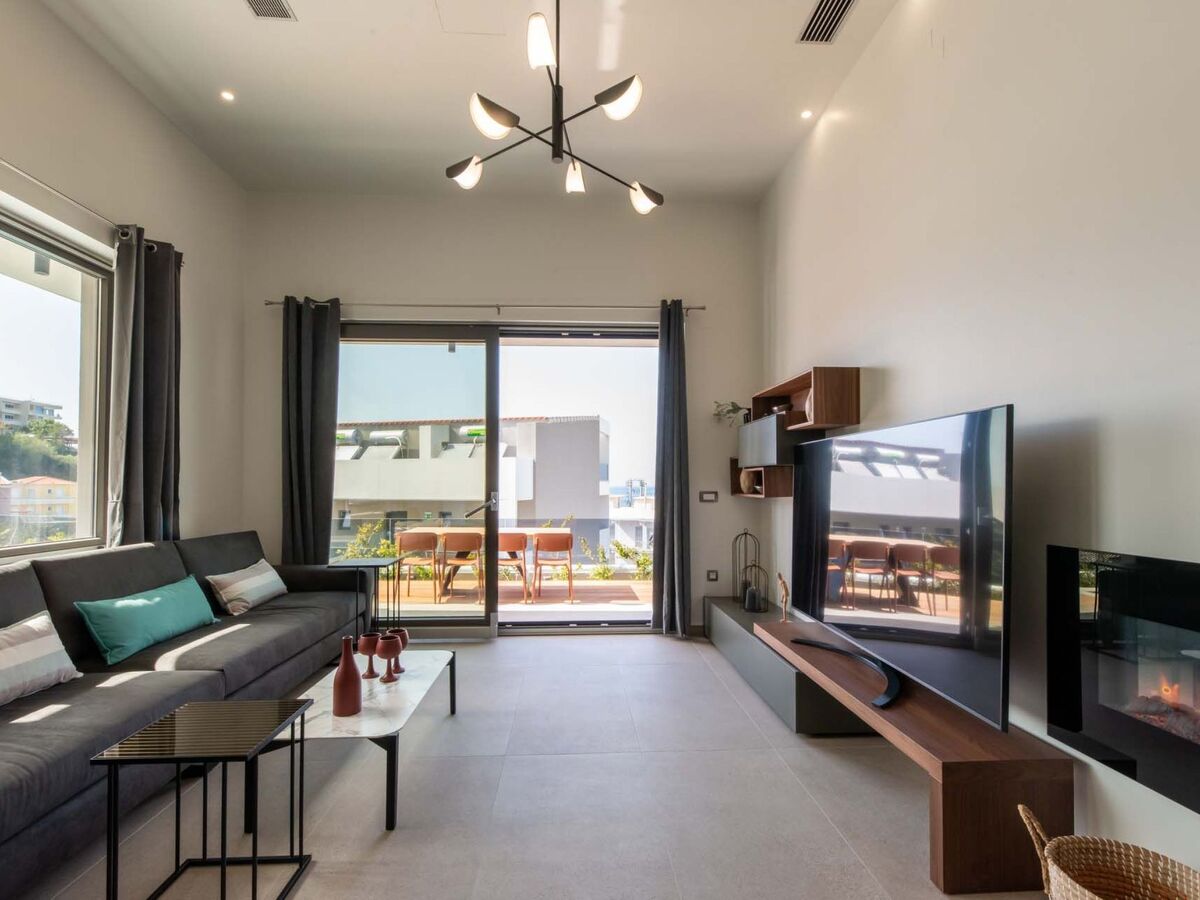 Salon avec canapé, 60'' satellite Smart TV, cheminée électrique, accès à la terrasse de la piscine, vue sur la mer
