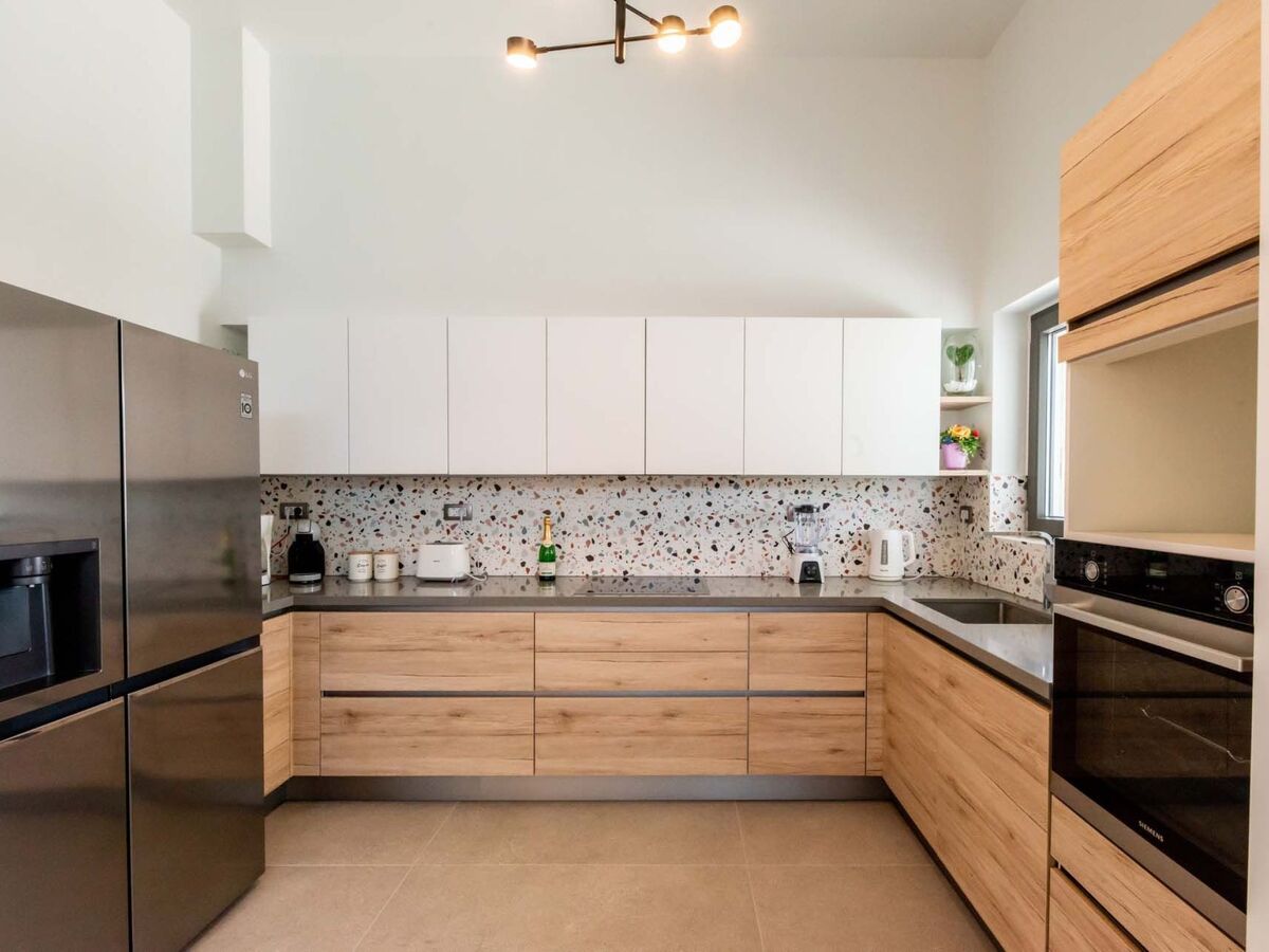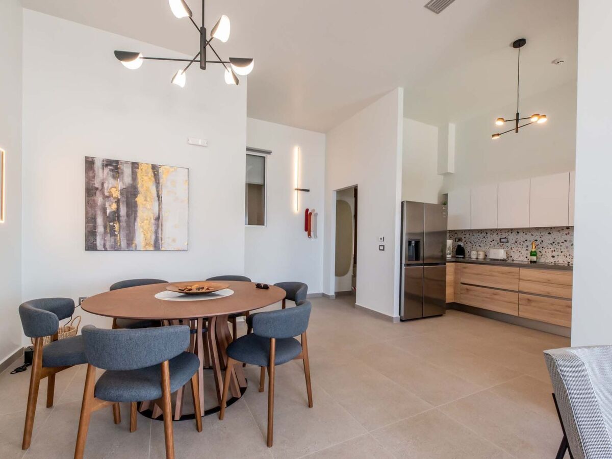 Cuisine ouverte entièrement équipée avec un coin repas pour 8 personnes et des appareils modernes