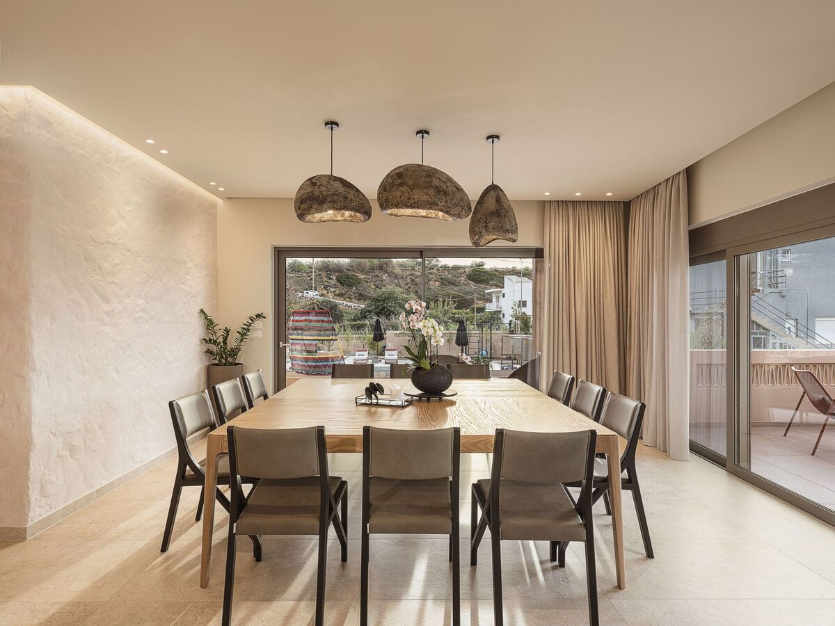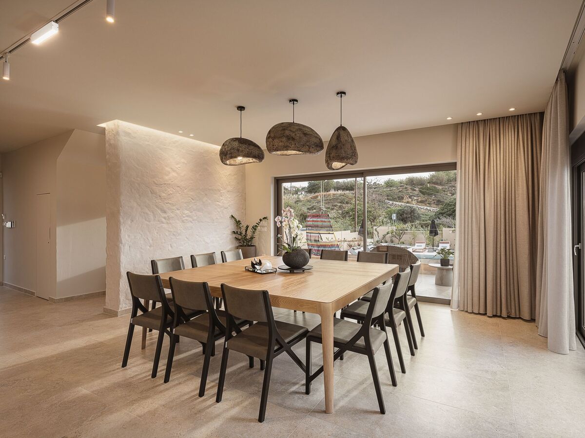 Dining area with a big table for 12 guests, direct access to the pool, and Seaview