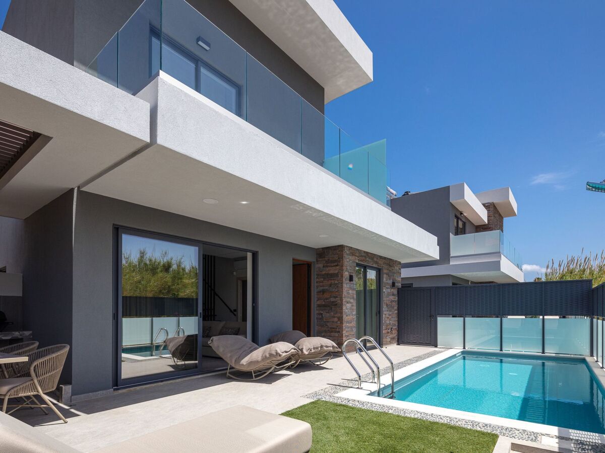 The 20 sqm private pool is surrounded by a sunbathing area with 2 sunbeds, 2 sez long chairs, and side tables for relaxing under the sun.