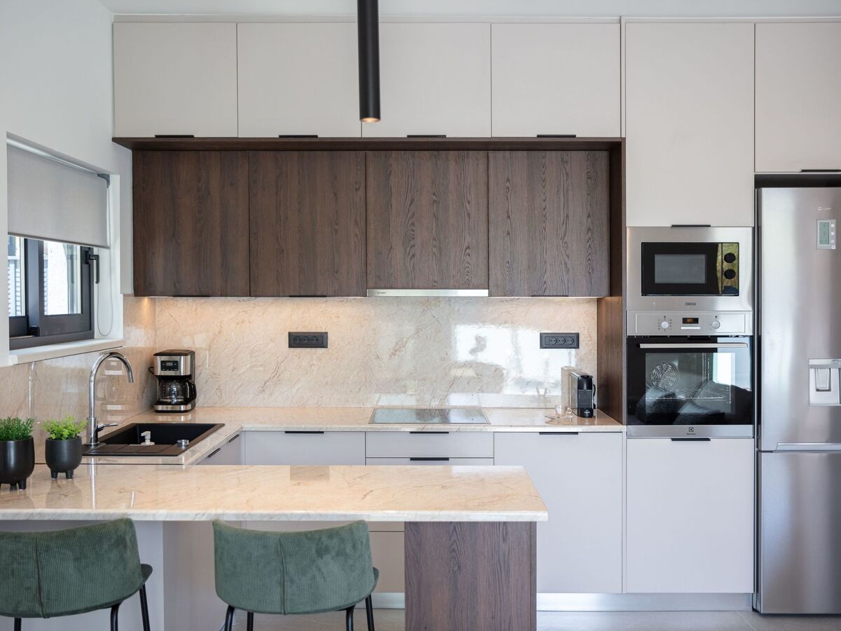 The adjacent fully equipped kitchen includes all modern appliances and a kitchen island with 2 bar stools for casual dining.