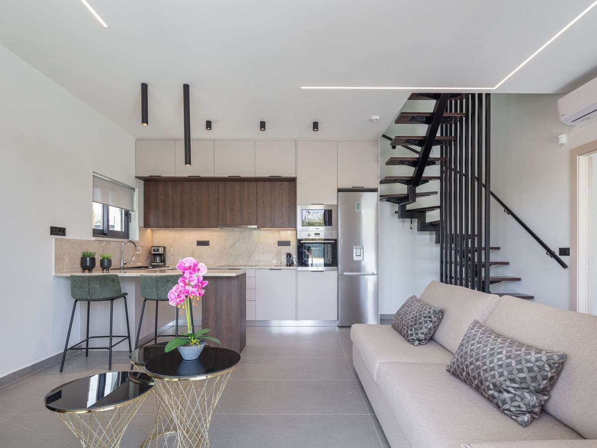 The ground level features a bright open-plan living area with minimalist design and warm neutral tones.