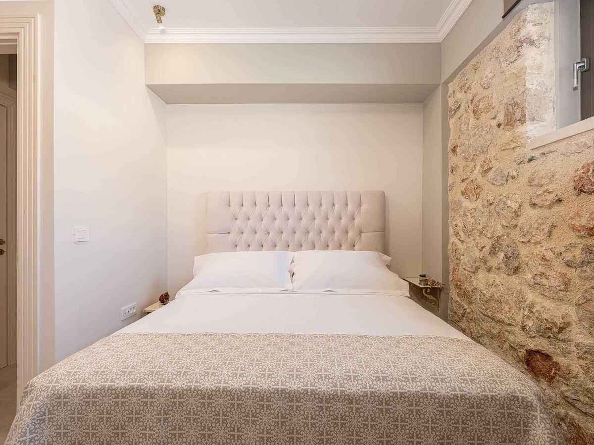 The walls on this level feature exposed, multicoloured stone, giving the space a rustic yet refined character.