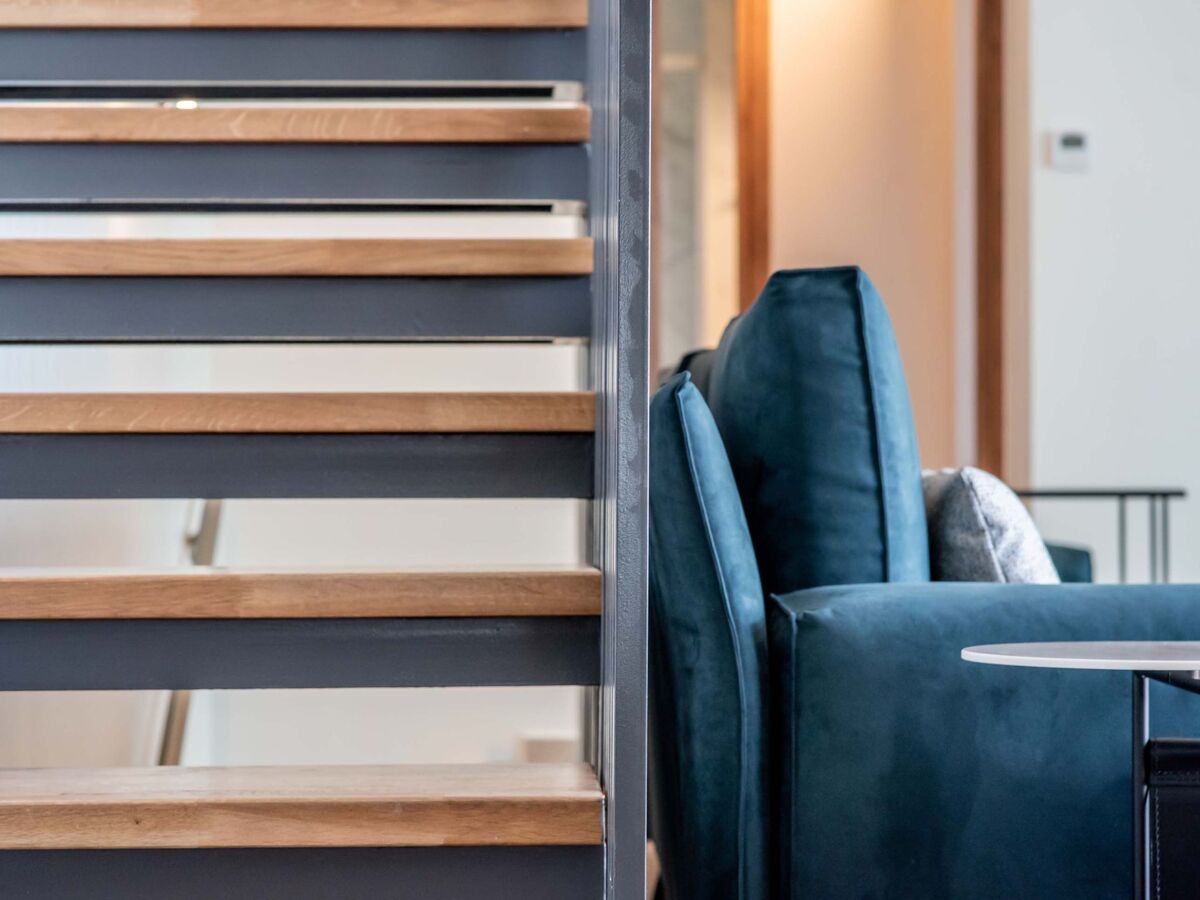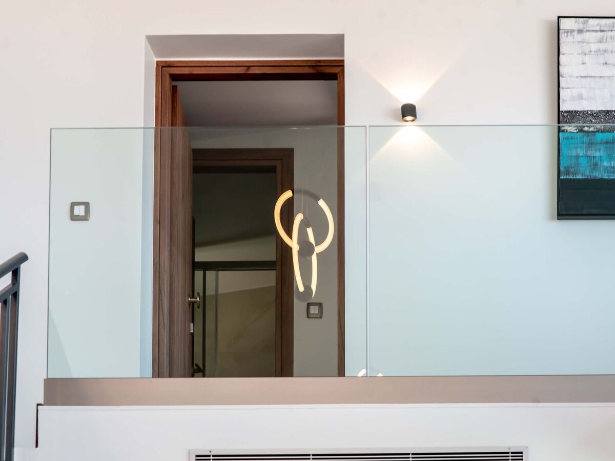 Au premier étage, il y a deux chambres avec des lits doubles et un accès à des balcons privés.