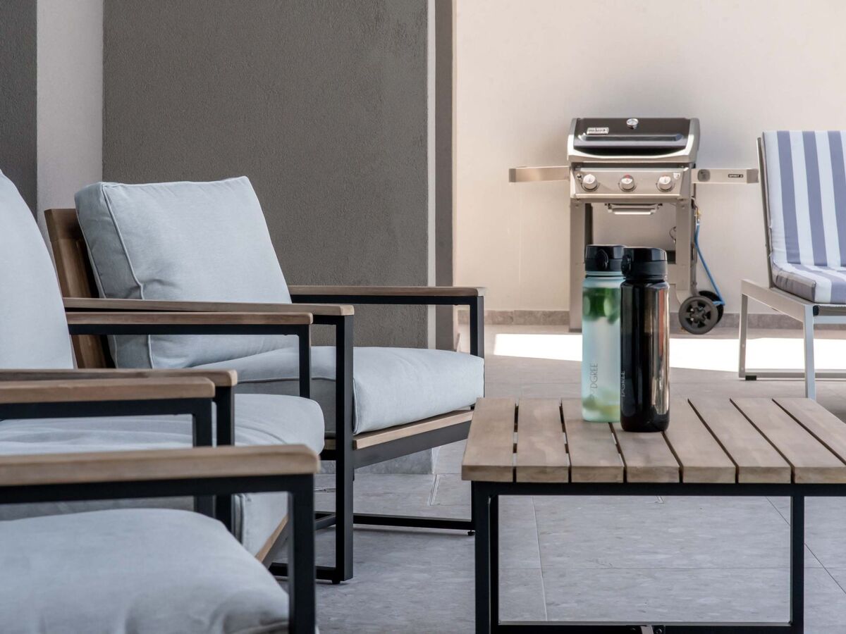À l'extérieur, un salon, une table à manger avec un barbecue à gaz complété par des meubles de patio.