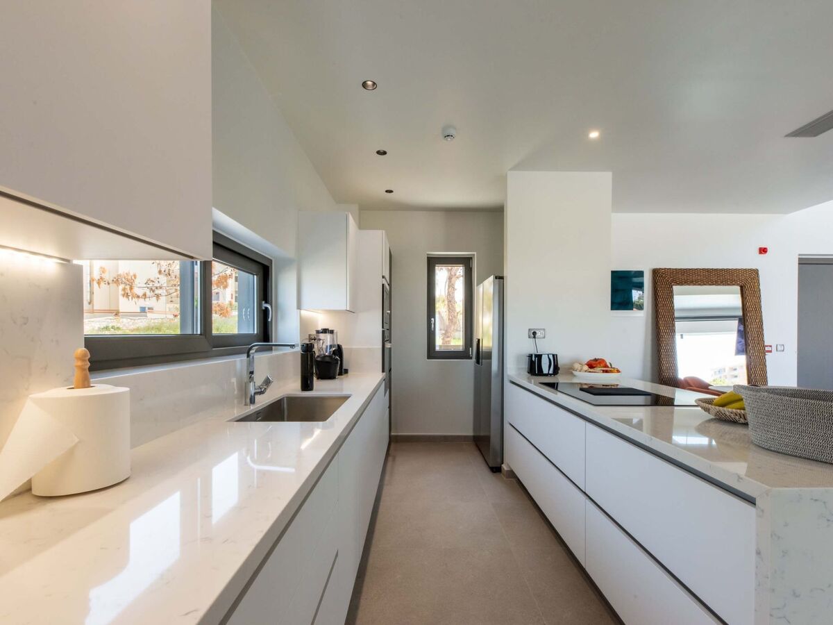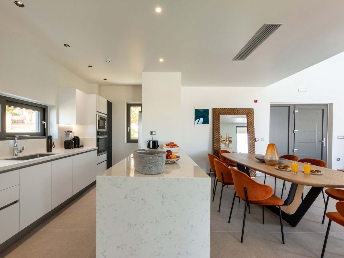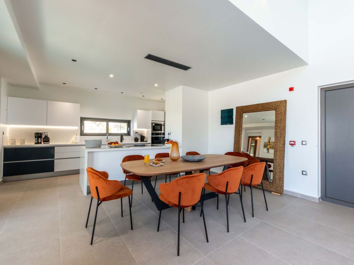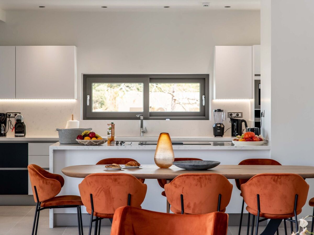 Cuisine ouverte entièrement équipée avec un coin repas pour 8 personnes et des appareils modernes