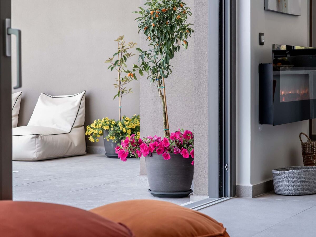 L'un d'entre eux est équipé d'une terrasse supplémentaire avec des chaises longues, un parasol, des chaises longues et une table.