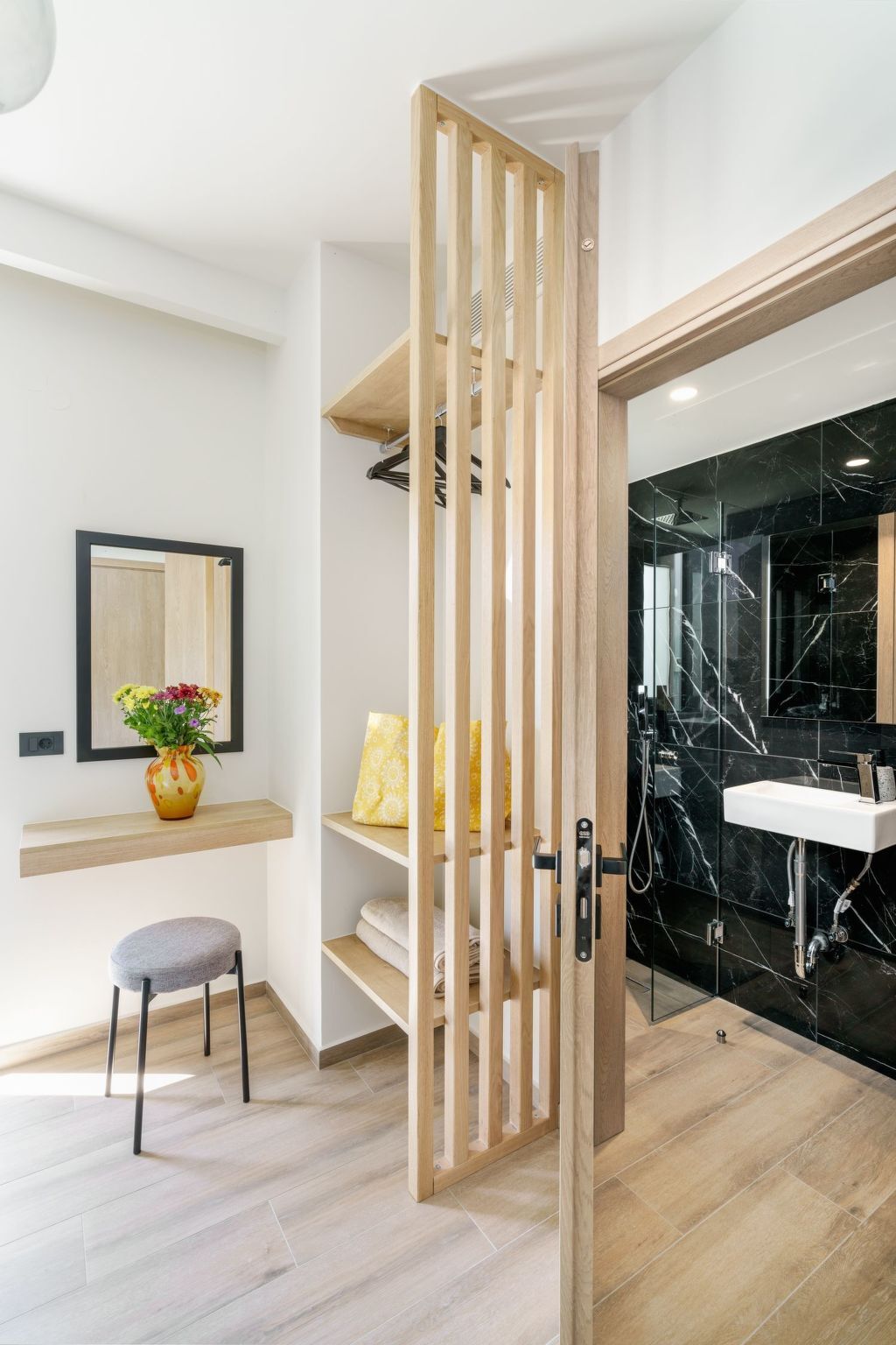 The first is a beautifully designed queen-size bedroom with a sea view, air conditioning, and direct access to the yard.