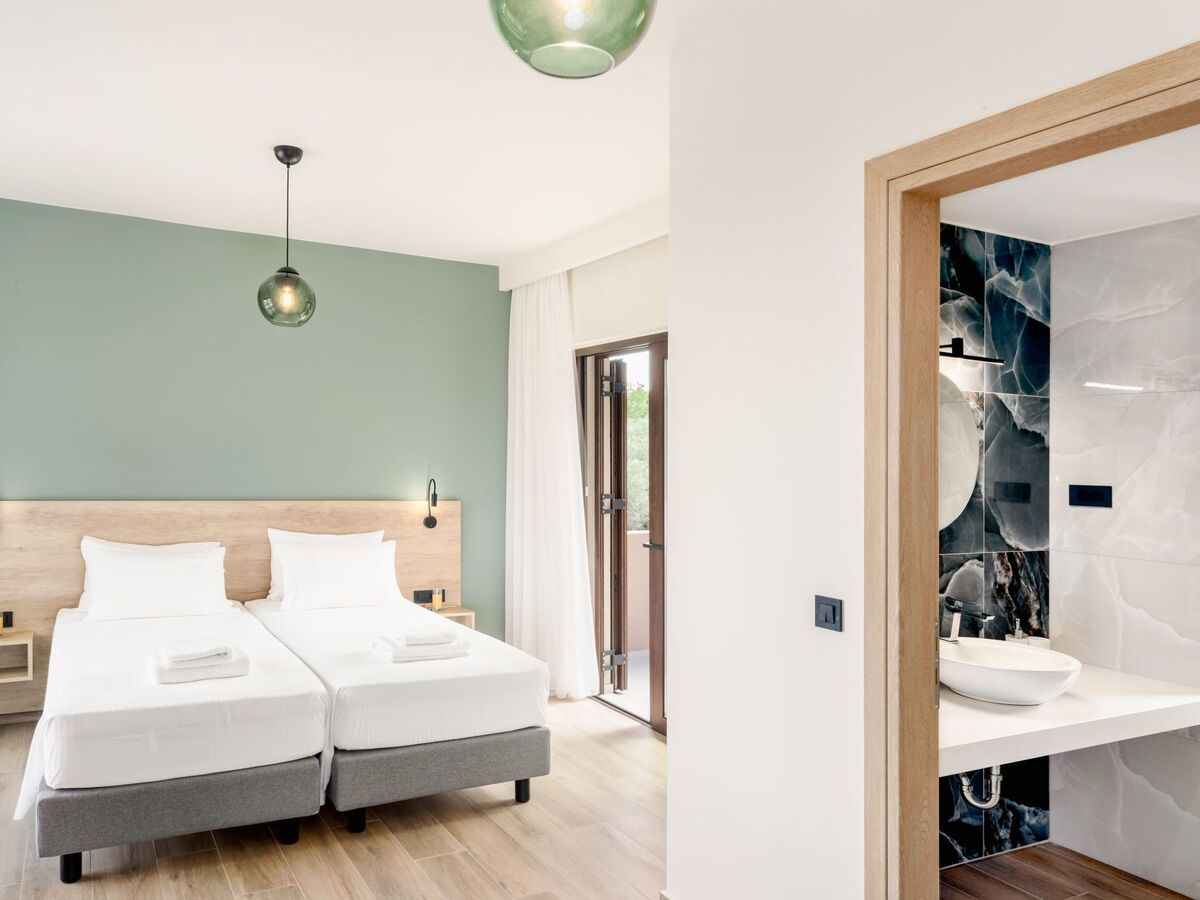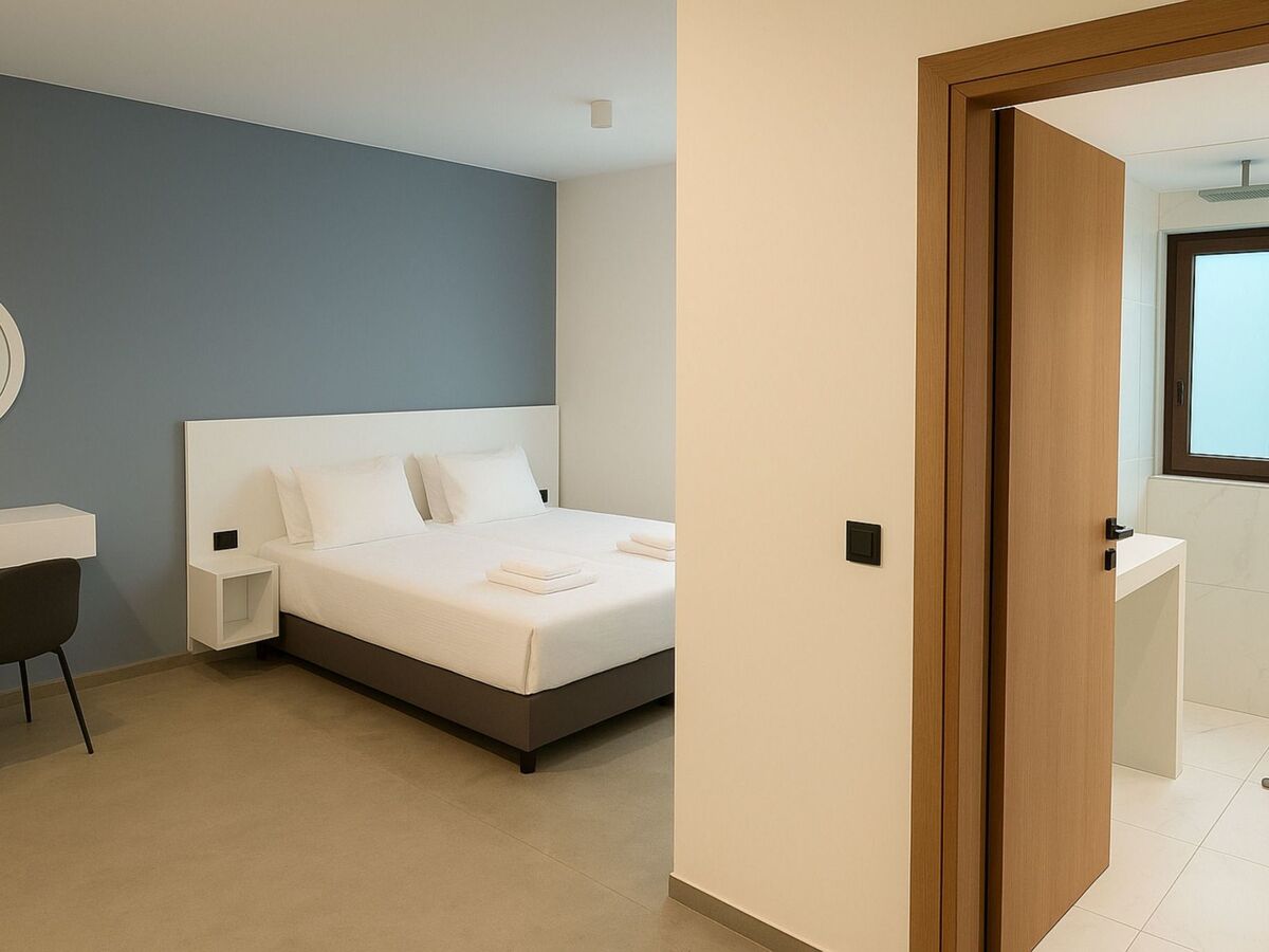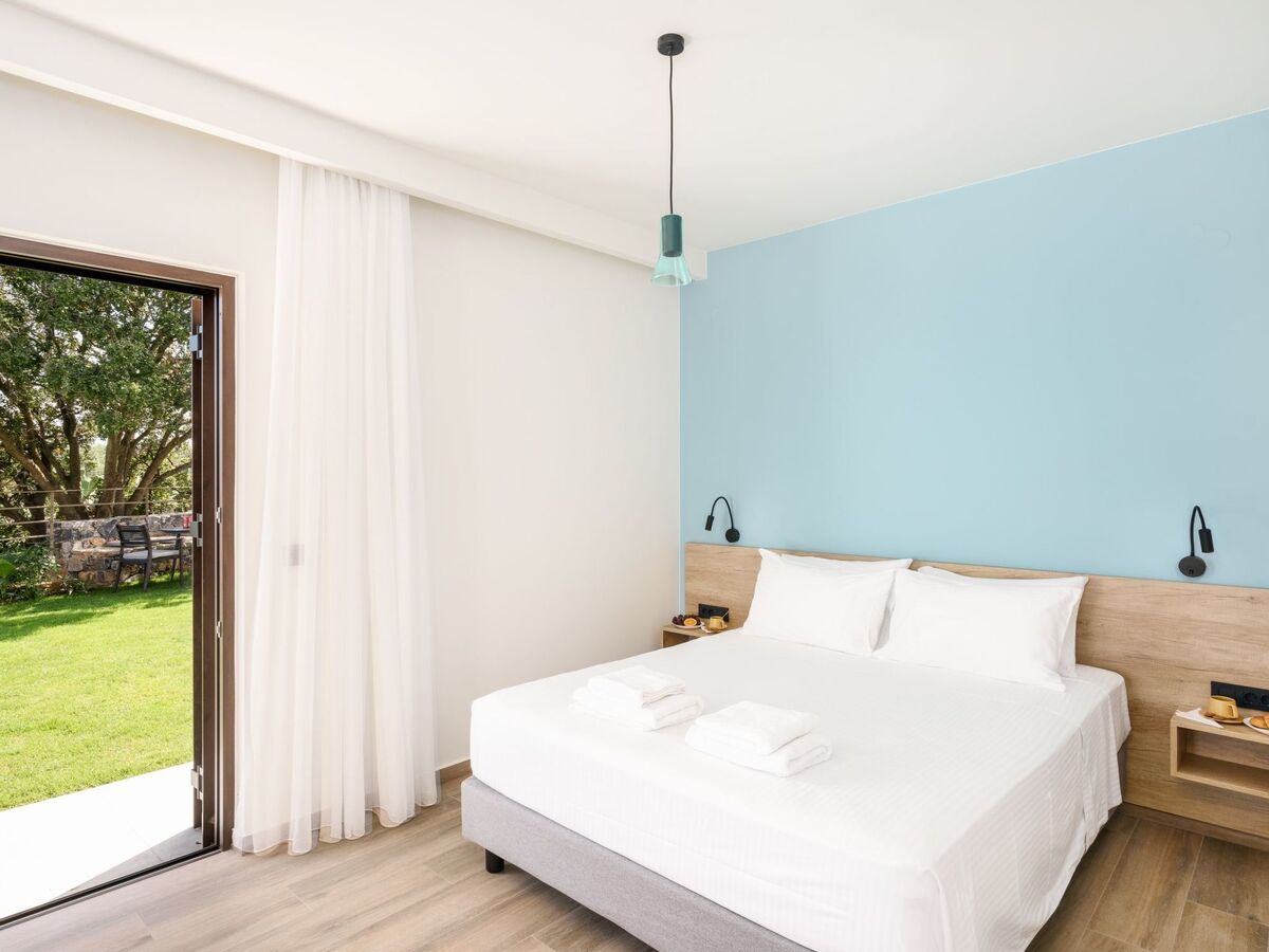 The pool area is furnished with sun loungers and umbrellas, providing ample space for sunbathing and enjoying the warm Cretan weather.