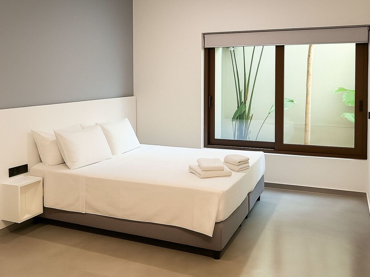 The second bedroom features a large single bed, an ensuite bathroom with a shower and hairdryer, and air conditioning, also with access to the yard.