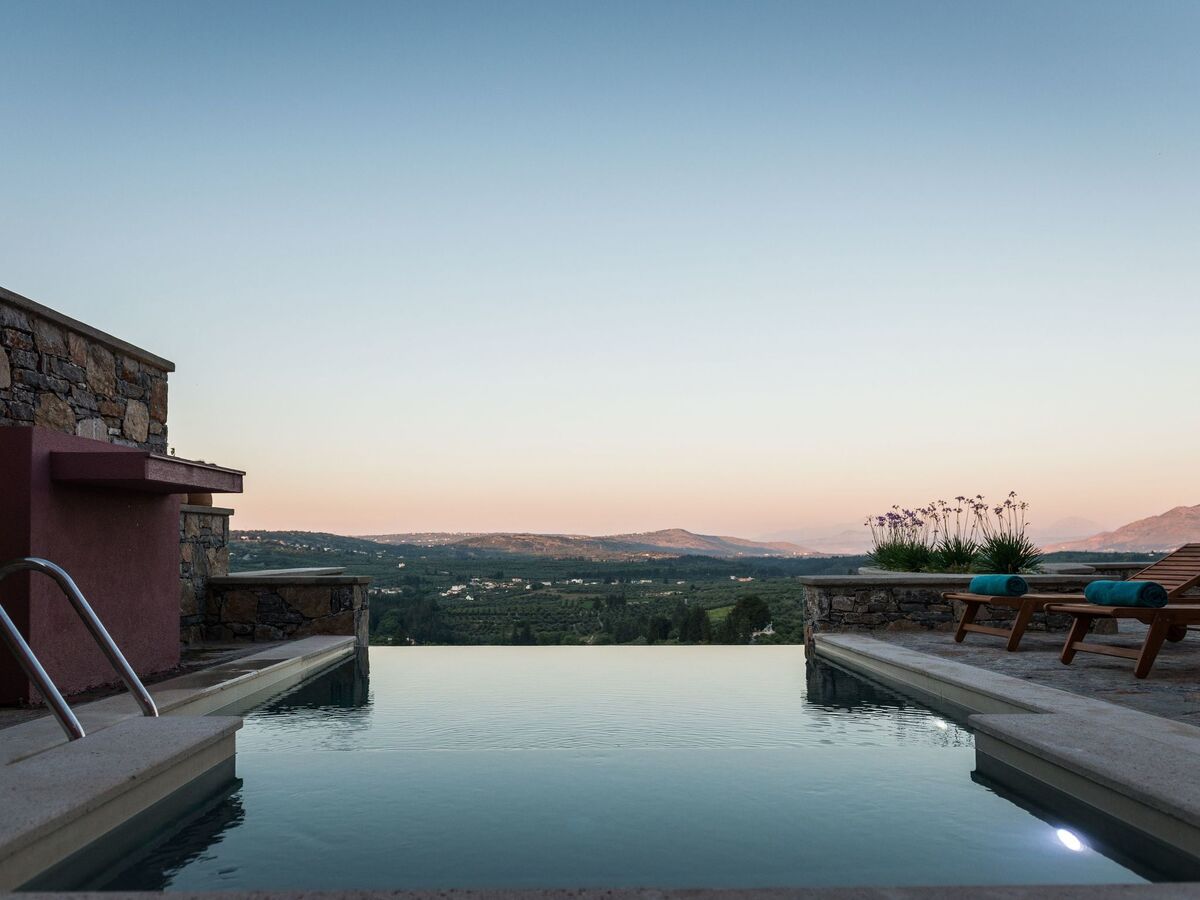 The pool is equipped with sun loungers while there is a stylish fountain, offering moments of relaxation under the sound of running water.