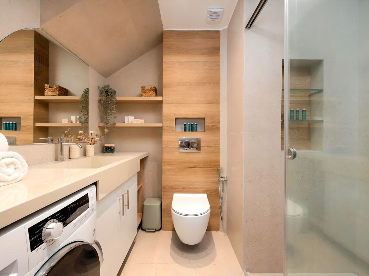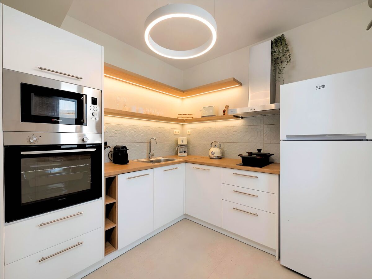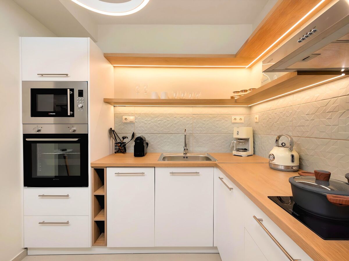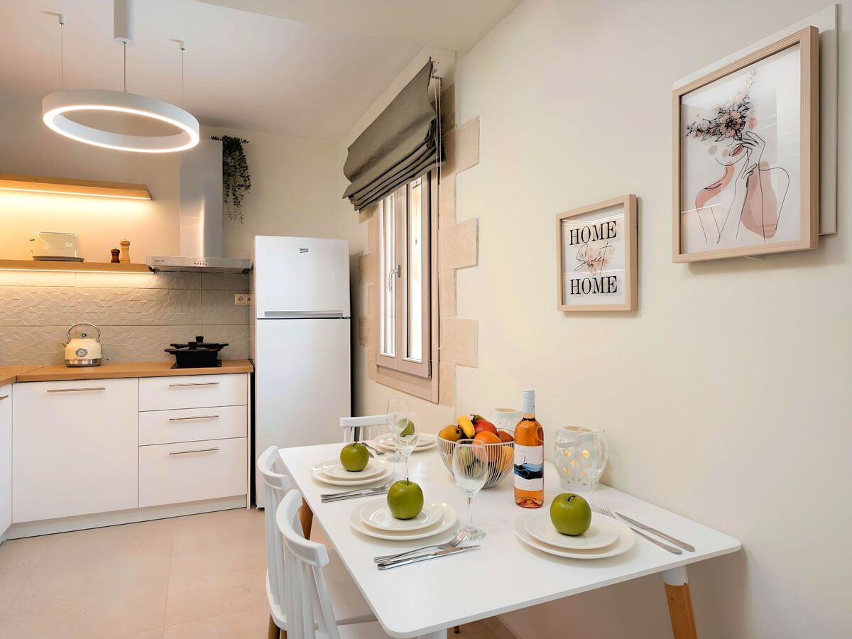 The chic living room area includes a sofa, a separate cozy dining room, a fine bathroom with a shower, and a fully equipped kitchen.