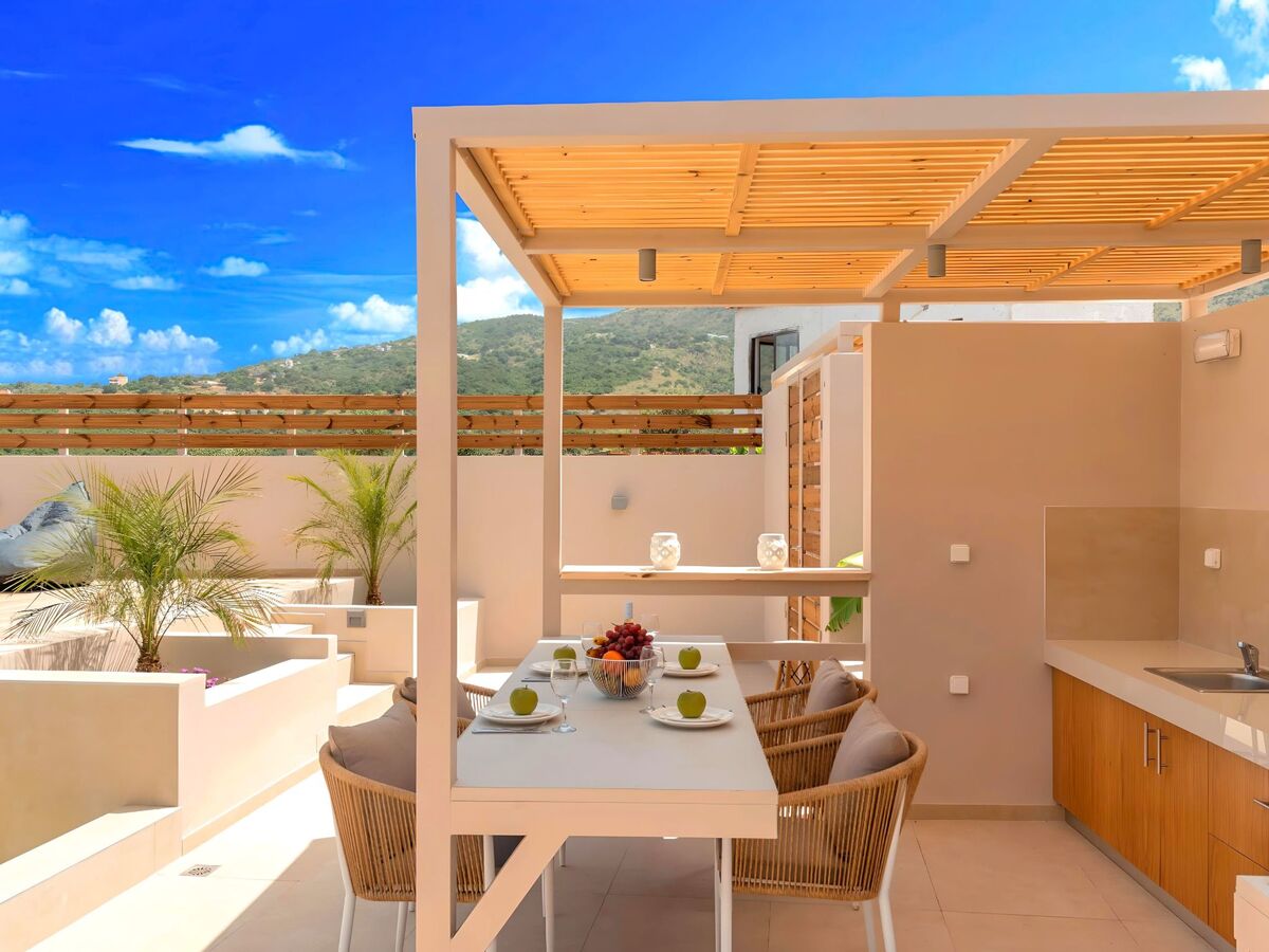 The villa features two bedrooms, each with a comfortable queen-size bed and an en suite bathroom with a rejuvenating shower.