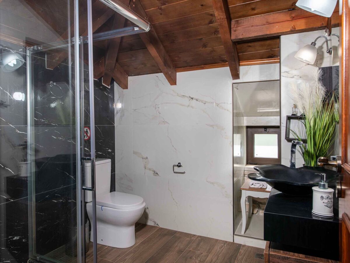 This level also includes two bedrooms, both with double beds, as well as a shared bathroom with a shower.