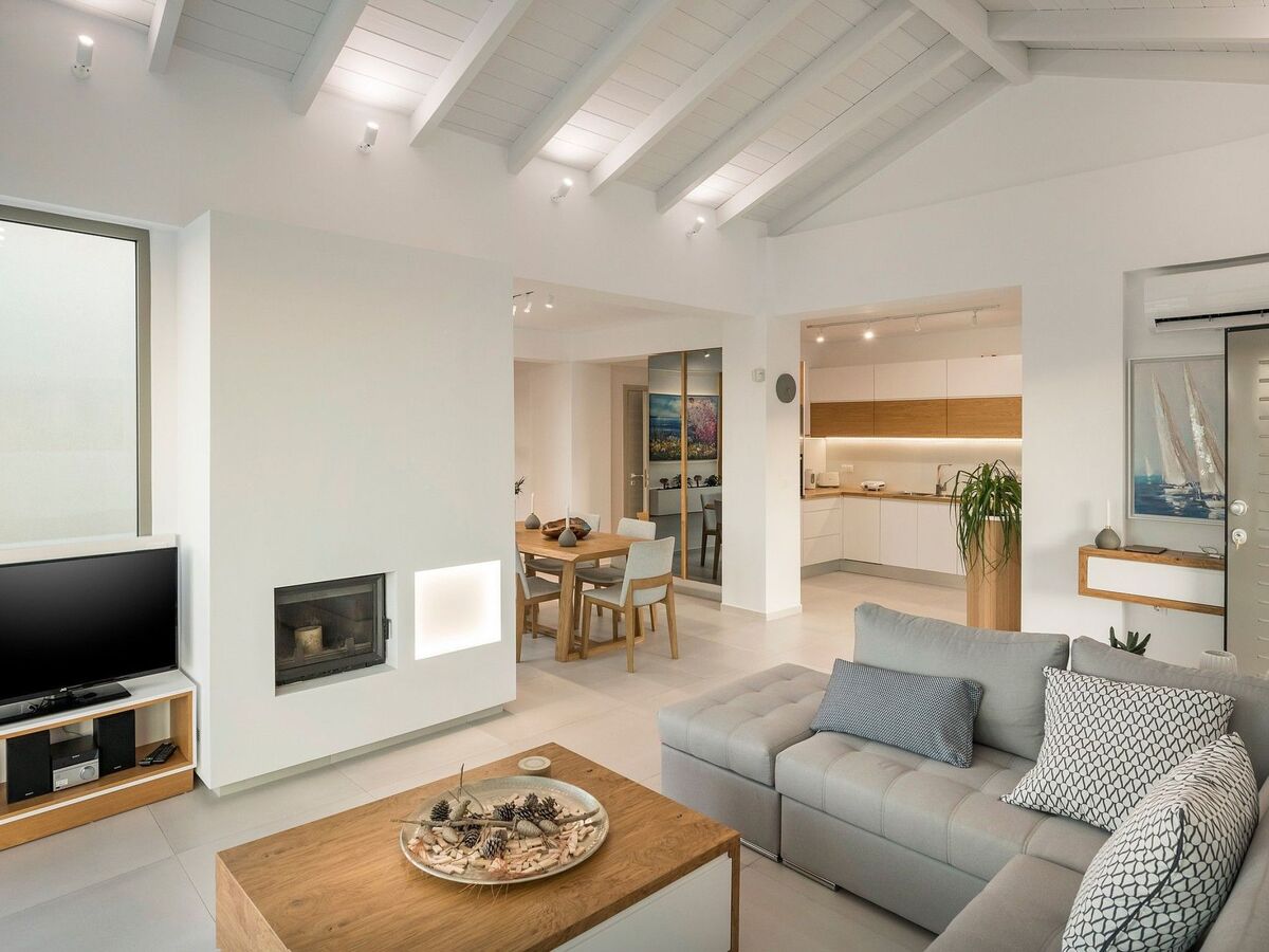 Dans le même espace, vous trouverez une cheminée que vous pourrez allumer pendant les jours et les nuits froides de vos vacances.