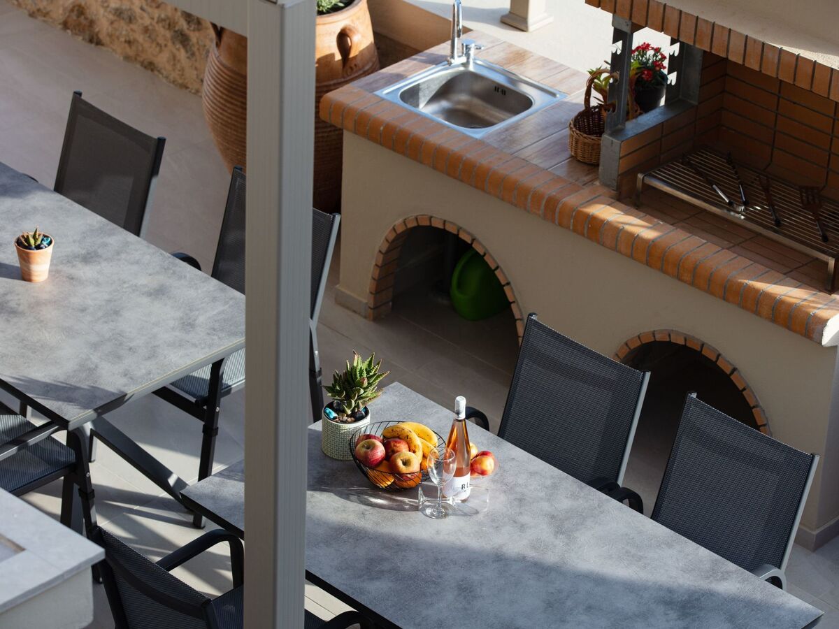 Additional features include various furnished relaxation spots, a shaded pergola with an outdoor barbecue, a sink, dishes, utensils, and a large dining table.