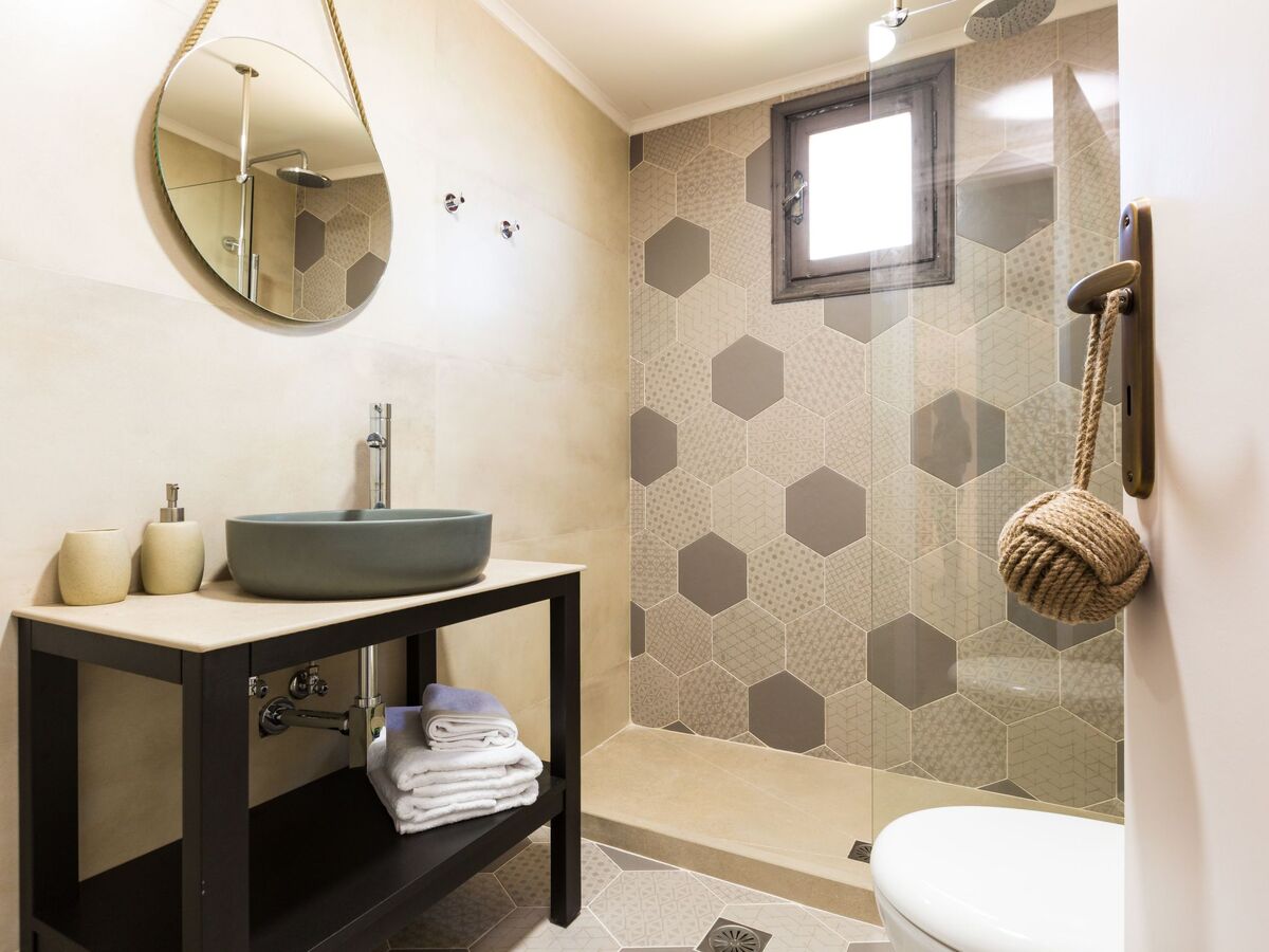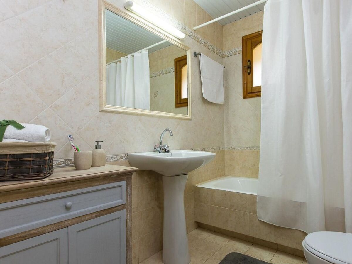 Of the two bathrooms, one has a bath with a shower attachment and a washing machine, and the other has a shower cubicle.
